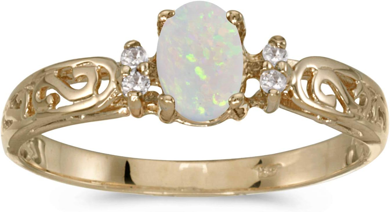 This 10k yellow gold oval opal and diamond ring features a 6x4 mm genuine natural opal with a 0.19 ct total weight.October Birthdays: Opal is the birthstone for those born in the month of October. Opals are known for the stunning array of colors showcased by each stone.Unique Look: Our opal stones are genuine, natural and not enhanced, giving each a one of a kind look. No two opals look alike, so these special gemstones may not look as pictured.Give as a Gift: Made from genuine, high quality gold and gemstones, this fine jewelry makes an excellent gift, perfect for birthdays, as a romantic anniversary gift, holiday gift, or for a special occasion. Help a loved one celebrate a special milestone, whether it is sweet sixteen, prom, graduation, a new job or a new baby, the right piece of fine jewelry can enhance any moment! Meaningful Beauty: The right piece of jewelry will allow you to create elegant, sophisticated looks for formal events, or add a luxurious element to your day to day or business wear. But you can also use fine jewelry to add some symbolic meaning to a look or gift choice, choosing gem that aligns with a birthstone, Zodiac sign or even the day of the week a person was born! Alternately, choose a flattering or favorite color gemstone. General Care: Preserve your fine jewelry and keep it looking its best with proper storage and cleaning. Store jewelry in a clean, dry place and inspect your jewelry at least once a year for loose prongs, worn mountings and general wear and tear. Avoid using harmful chemicals, makeup and hair products as these can damage your jewelry. A professional cleaning is advised one per year to help maintain these cherished items.