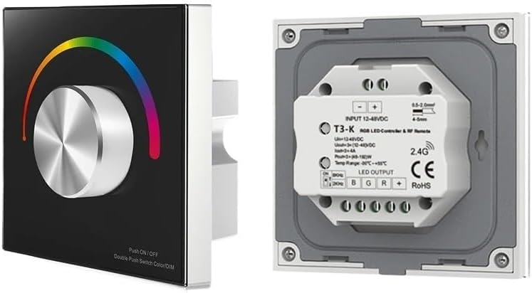 controllerDimmersIntroducing the T3-K a 3-channel constant LED rotary dimmer and RGB LED controller. Designed for maximum convenience this dimmer provides switching brightness and color adjustment capabilities as well as consistent voltage output. The T3-K's knobs enable precise smooth color adjustments while seamless brightness control ranges from 0.1% to 100% providing flicker-free protection for your eyes.The dimmer operates from 12-24V and uses PWM as the output type supporting RGB lighting for a vibrant and customizable lighting experience. T3-K has a remote control distance of up to 30 meters has 4096 levels of gray and provides a wide dimming range from 0% to 100%.With compact dimensions of 86 mm long x 86 wide x 37 mm high and weighing only 110 grams the T3-K is the perfect addition to any lighting setup. Its RGB panel control allows for easy and intuitive adjustments while 4096 levels of flicker-free dimming ensure a perfect lighting experience.Equipped with status indicators for power on/off and touch operation the T3-K provides a user-friendly interface. In addition its cascading feature enables uninterrupted signal transmission from one receiver to the next extending the control range to 100 meters. Combining T3-K with a constant voltage power expander can infinitely amplify the output power.Enhance your lighting setup with the state-of-the-art 86 wall-mounted RGB panel dimmer T3-K. Experience seamless and precise control of your lighting taking your ambience to unprecedented heights.