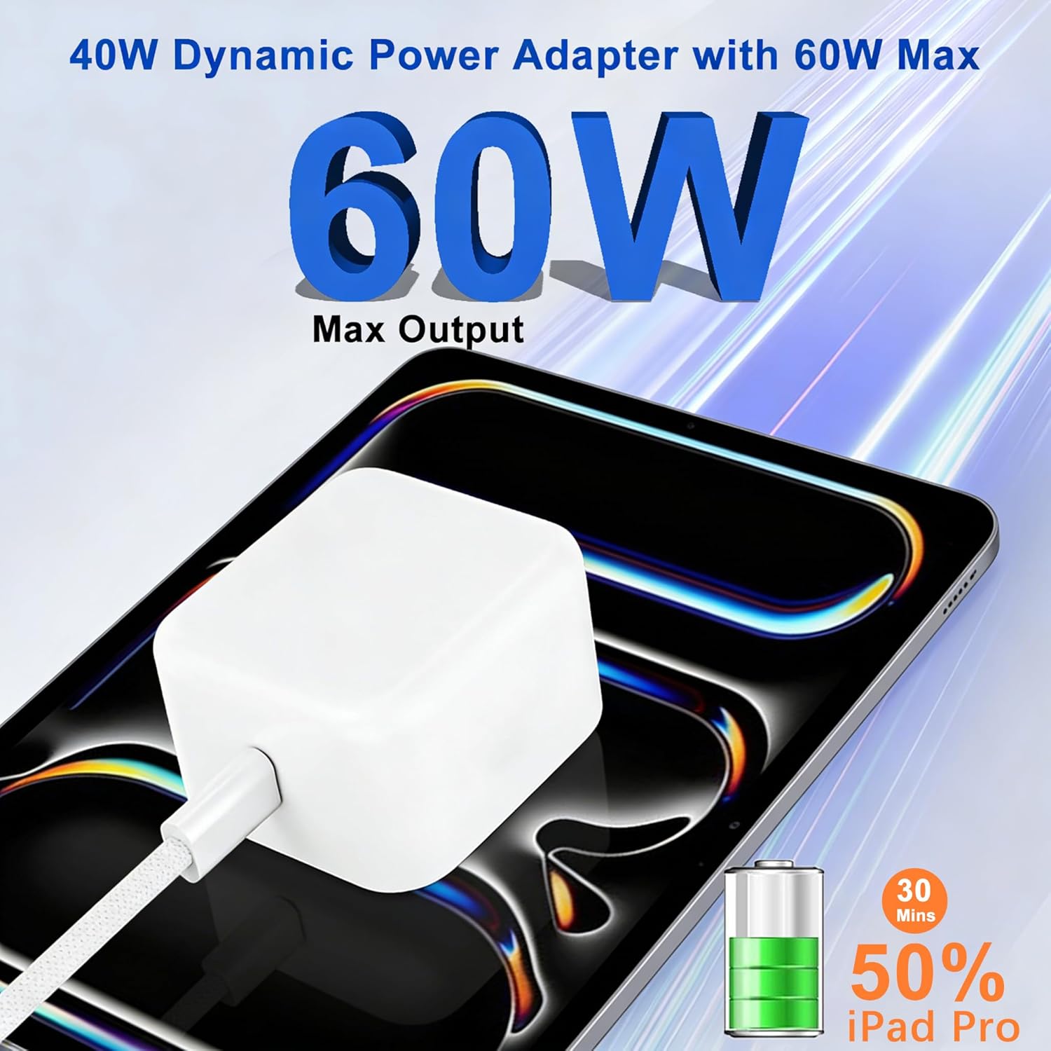 40W Dynamic Power Adapter with 60W Max40W USB C power adapter adopts a unique dynamic power regulation design, with a maximum output power of up to 60W, providing a powerful boost in charging speeds for your iPad Pro/Air/Mini.Dynamic Charging block built-in smart chip that auto-matches the optimal current for your device.It's equipped with comprehensive protection against over-voltage,over-heat,short-circuit,and over-current.The foldable Apple 40W USB C wall charger block compact,foldable design saves space while meeting high-power demands and prevents the items inside the bag from being scratched.6FT USB C to USB C Woven Fast Charging Cable6FT Long MFi certified charging cable can connect your iPad with MacBook directly enjoy the 480 Mbps data transfer speed.6 feet USB C to USB C cable perfect length can charge your device in a comfortable position,providing greater flexibility and convenience.USB-C to USB-C braided cables are resistant to stretching and bending, have a longer service life and are durable.Universal CompatibilityiPad Pro 13 inch M5/M4iPad Pro 12.9 inch 6th/5th/4th/3rd GeniPad Pro 11 inch M5/M4/4th/3rd/2nd/1st GeniPad Air 13-inch/11-inch M4/M3/M2, iPad Air 5th/4th GeniPad 11 inch A16, iPad 10th GeniPad Mini A17 Pro, iPad Mini 6th GeniPhone 17 Series/iPhone 16 Series/iPhone 15 SeriesWhat You Get2Pack 40W dynamic power adapter with 60W Max2Pack 6FT USB C to C woven fast charging cords
