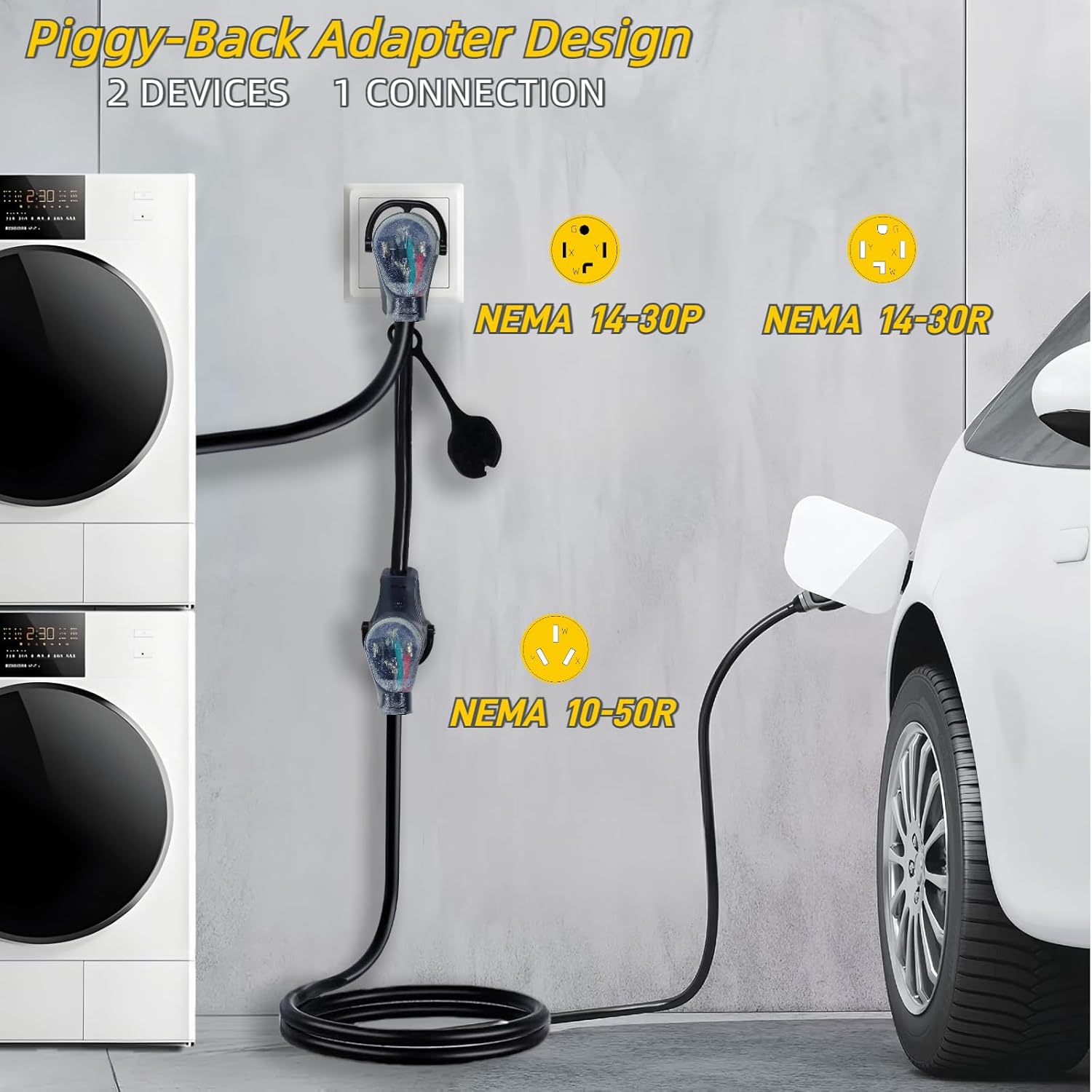 Elecstream Tech 4-Prong 30 Amp Dryer Piggy-Back Splitter Adapter NEMA 14-30P to 14-30R/10-50R Power Cord Adapter for EV Car Charging at Dryer Outlet 250V, 1.5 FT