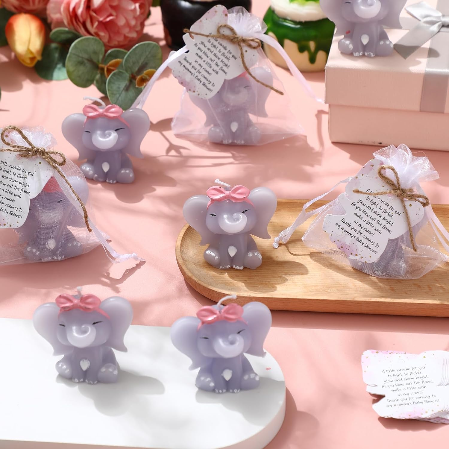 The combination of cute elephant shaped candles and thank you cards gives this baby shower party favors gifts a high perceived value, which makes guests feel appreciated and valued, enhancing the overall guest experience. Package includes: 50 x elephant shaped baby shower candles, 50 x thank you cards, 50 x organza gifts bag, 1 x double hemp rope Size: baby shower candles: 2.4 x 2 inches / 6 x 5 cm elephant shaped thank cards: 2.4 x 2 inches / 6 x 5 cm organza bags: 4.72 x 3.94 inches / 12 x 10 cm double hemp rope: 78.8 inches / 2 m long Color: pink Notes: Manual measurement, please allow slight errors on size. The color may exist a slight difference due to different screen displays. Burning may produce a pungent smell. Open flame may pose a risk of burns, please keep away from children.
