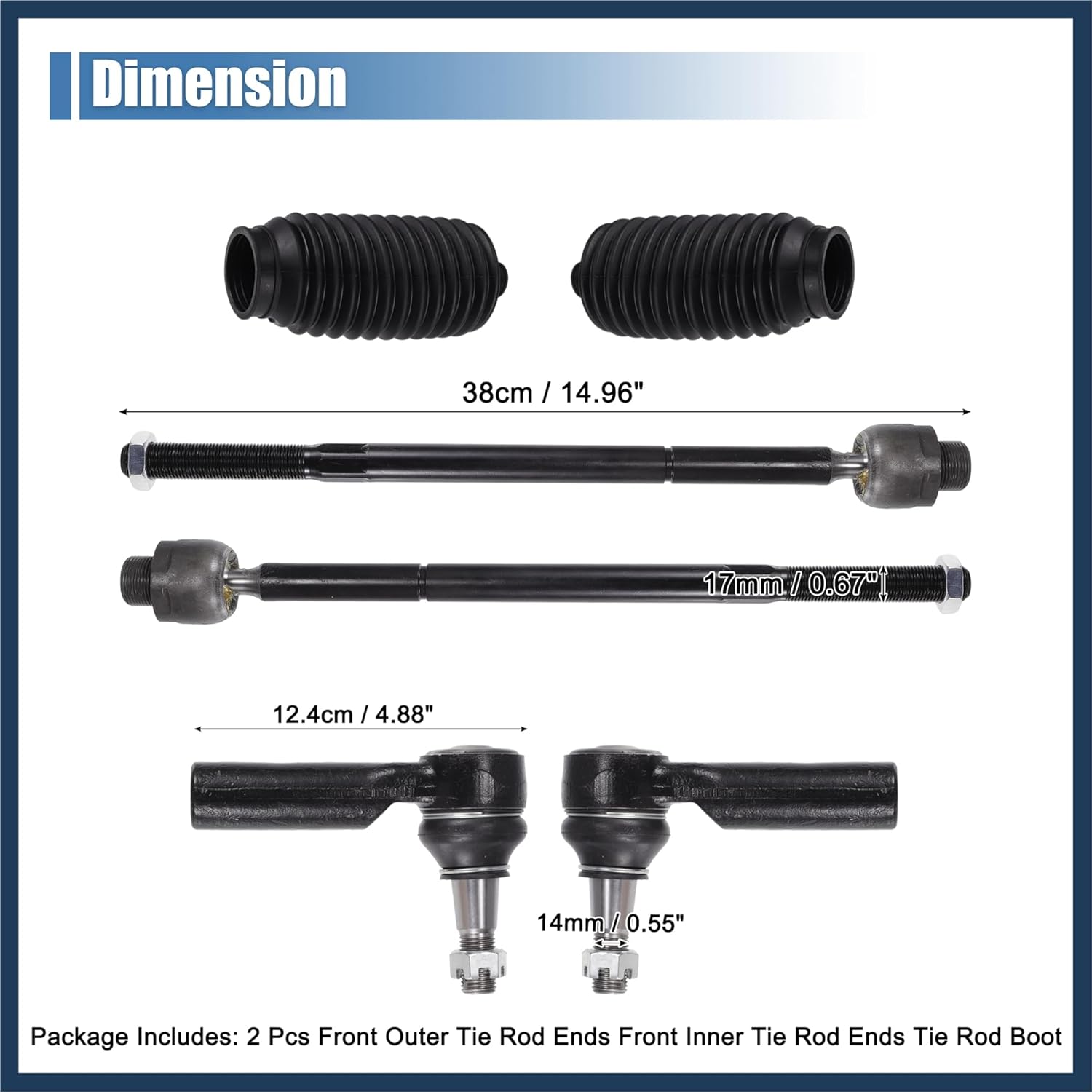 Fitment:for Dodge for Ram 1500 2006-2010 5-Lug Models Onlyfor Ram 1500 2011-2012 5-Lug Models OnlyFeatures:Front inner and outer tie rod ends are made of durable rubber and iron material, which is more wear-resistant and waterproof, durable, and not easy to break.Tie rod end kit can restore like new steering and handling.Direct replacement of the old or broken tie rod ends, no need to make any changes.The car's handling ability decreases, you may need to replace the suspension inner outer tie rod endsThis is a non-OEM product, accessory only!Specifications:Color: BlackMaterial: Rubber, IronType: Steering Tie Rod EndPlacement On Vehicle: Front, Inner, Outer, Left, RightInner Tie Rod End: 38cm / 14.96"(L)Outer Tie Rod End: 12.4cm / 4.88"(L)Inner Tie Rod End Screw Diameter: 17mm / 0.67"(D)Outer Tie Rod End Screw Diameter: 14mm / 0.55"(D)Installation Steps:1. Loosen the pinch nut and remove the cotter pin.2. Remove the castle nut and the outer tie rod end.3. Remove the boot and the inner tie rod end.4. Replacing a new tie rod and installing it back according to the method of disassembly.Package Includes:2 x Front Outer Tie Rod Ends2 x Front Inner Tie Rod Ends2 x Tie Rod Boot