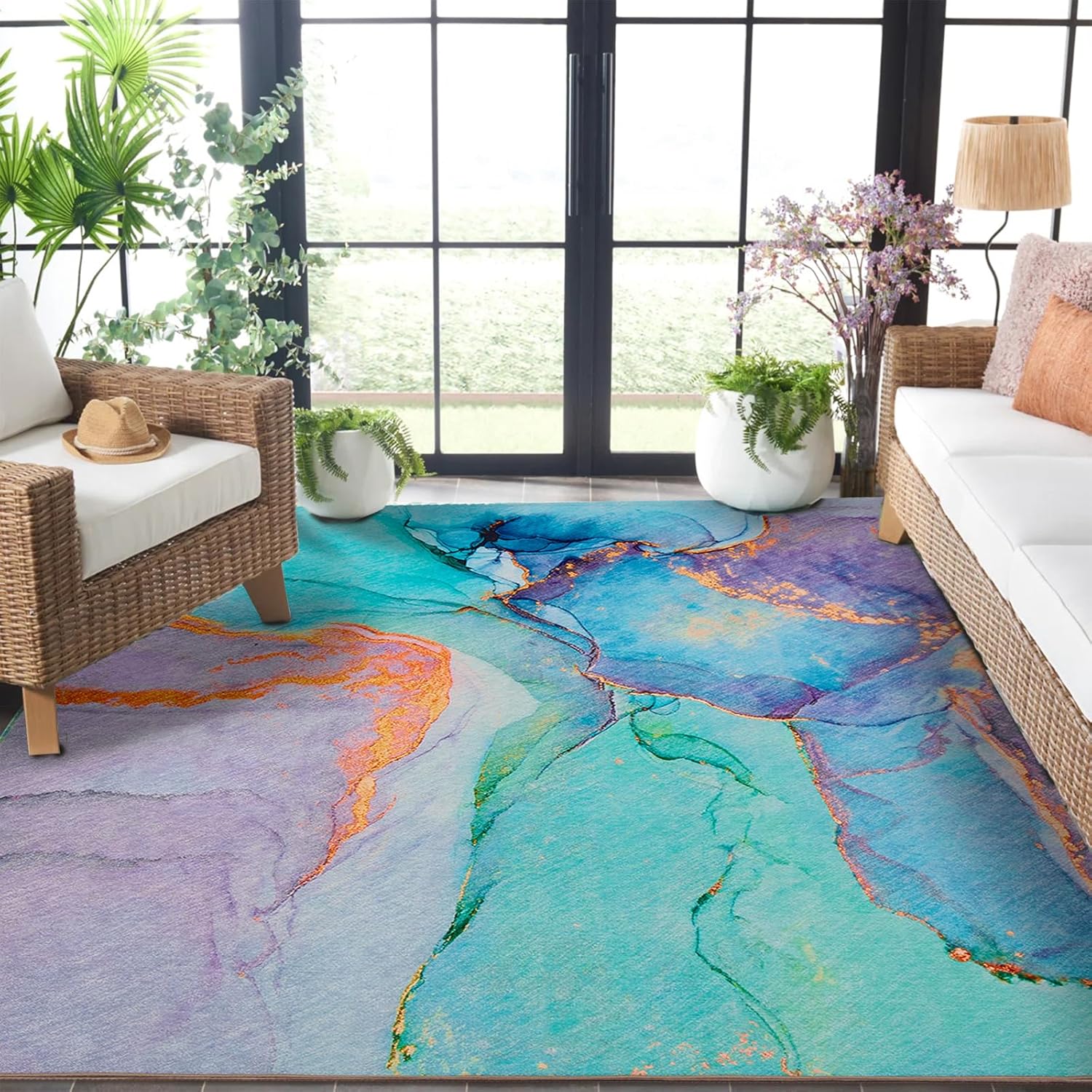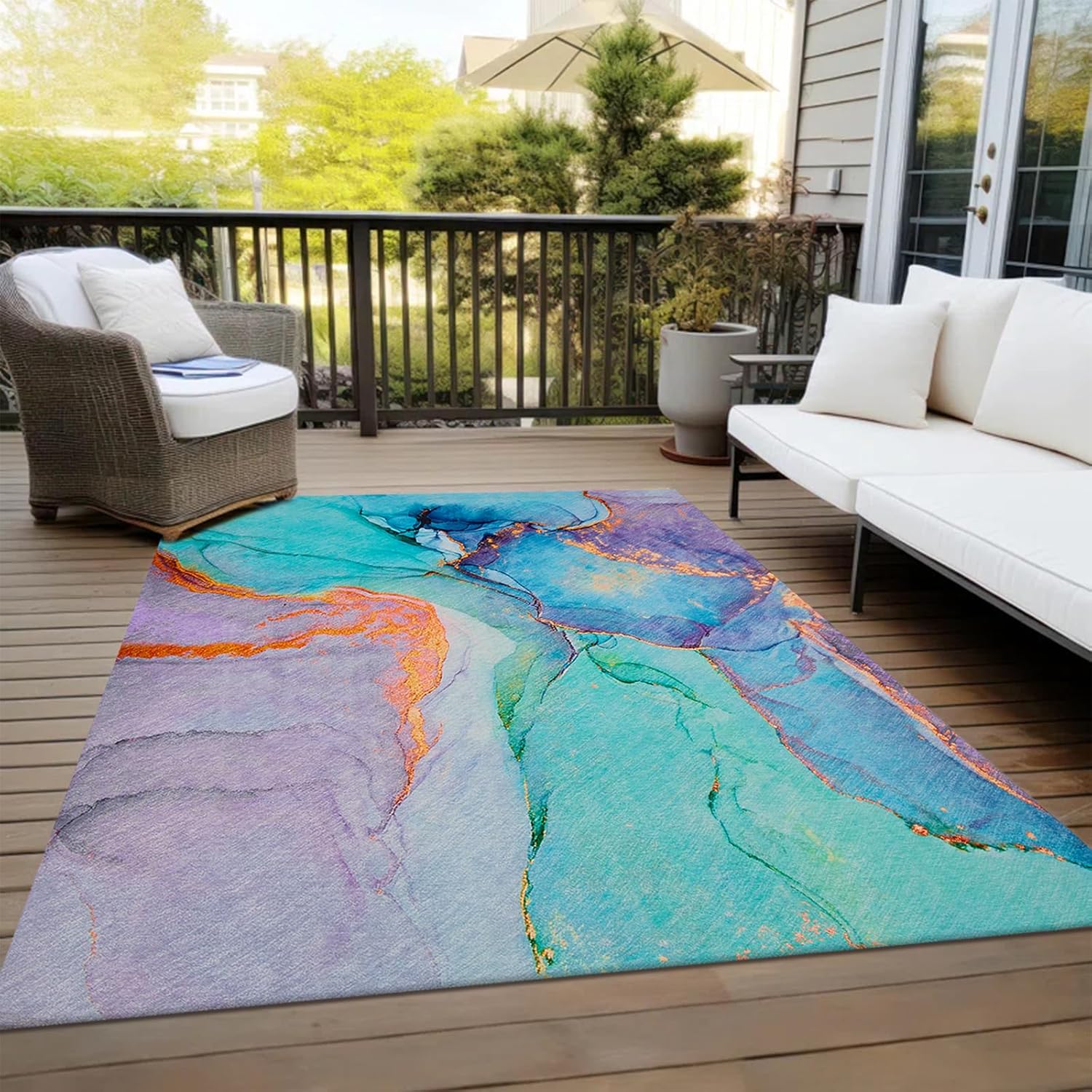Abstract Washable Indoor Outdoor Rug, 5' x 7.6', Teal, Stain Resistant, Easy Clean, Modern Marble Abstract Teal Rug for Indoor/Outdoor Patio, Deck, Porch, Garden, Courtyard, outdoor teal rug, outdoor aqua rug, outdoor turquoise rug