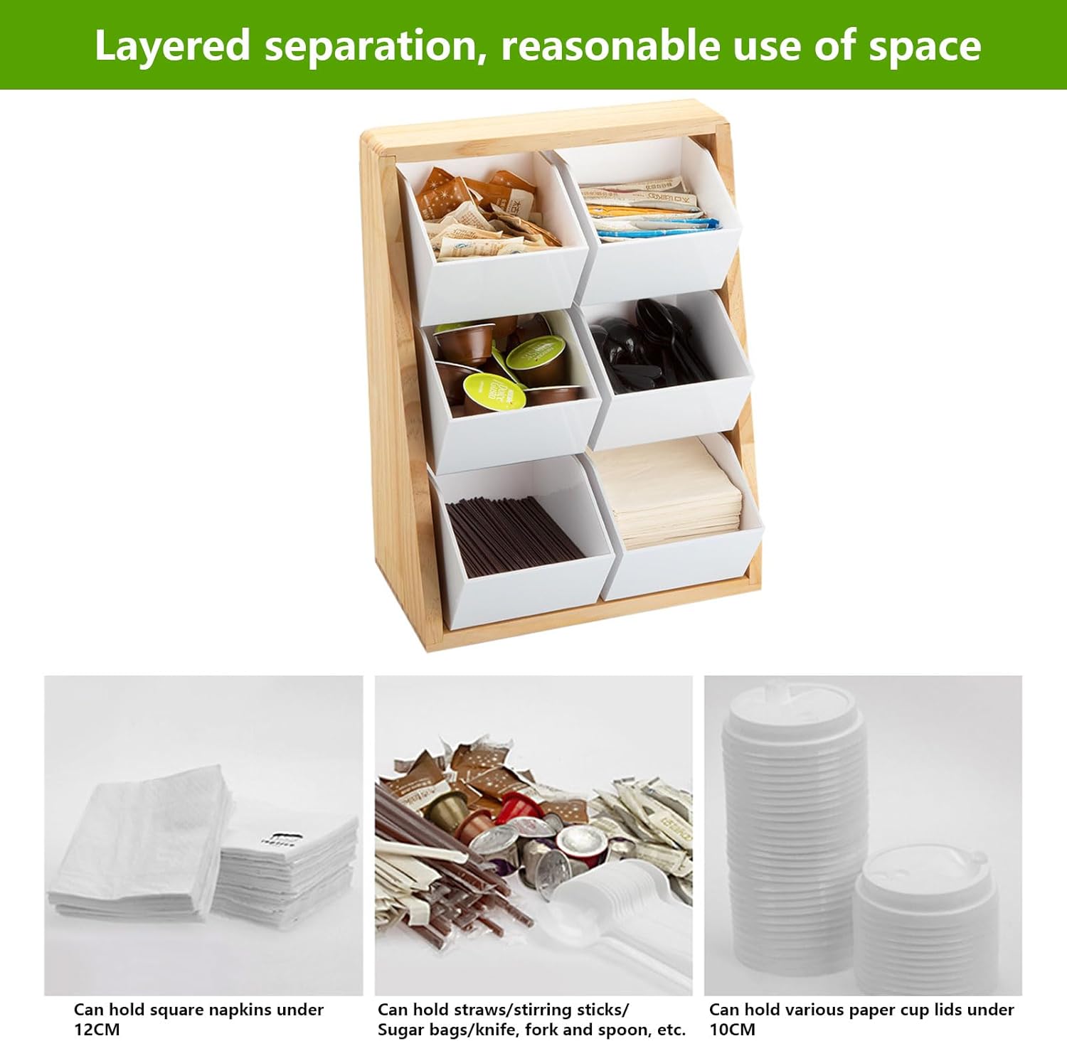 KITCHEN COUNTERTOP ORGANIZERAll kitchens need organizing and this is a sure way to organize those coffee condiments, salt and pepper packets, mustard and ketchup packets, and more.Designed with smooth modeling lines and smooth polishing, it's easy to clean and maintain. This wood coffee bar organizer is suitable for home, office, cabinet, kitchen and more!FUNCTIONAL & VERSATILEThis coffee bar organizer countertop can be used to store tea bags, napkins, utensils, and other items used in beverage areas, kitchens, and breakrooms. Also can storage of small items simple and easy, small office supplies, letters, stationery, jewelry and more.Name: Coffee Condiment OrganizerMaterial: Acrylic+WoodScope of application: bar counters, restaurant, coffee shops, company break rooms, milk tea shops, coffee shops, etc.Package List:wood coffee bar organizer * 1