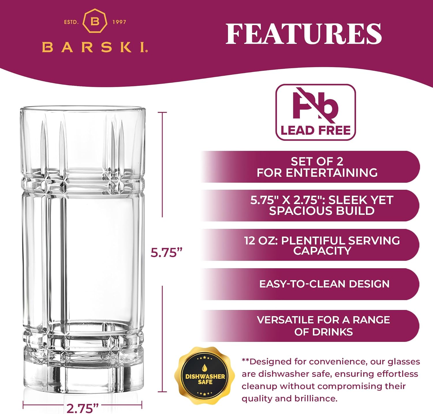 For over two decades, Barski Inc. has led the crystal and glass industry, blending quality with cost-effectiveness to meet consumer needs. This set of two highball glasses exemplifies that tradition, featuring a classic yet striking design that enhances any tabletop or bar setting. Meticulously crafted in Europe, each glass elevates the aesthetics of your favorite beverages. Whether you're hosting a casual gathering or a formal event, these glasses offer both functionality and style. This design measures 5.75" x 2.75" and has a capacity of 12 ounces, accommodating larger servings or drinks. Their robust build ensures regular use, while the dishwasher-safe feature provides modern cleaning convenience. Combining functionality and style, Barski's crystal glasses make every sip a statement of elegance.