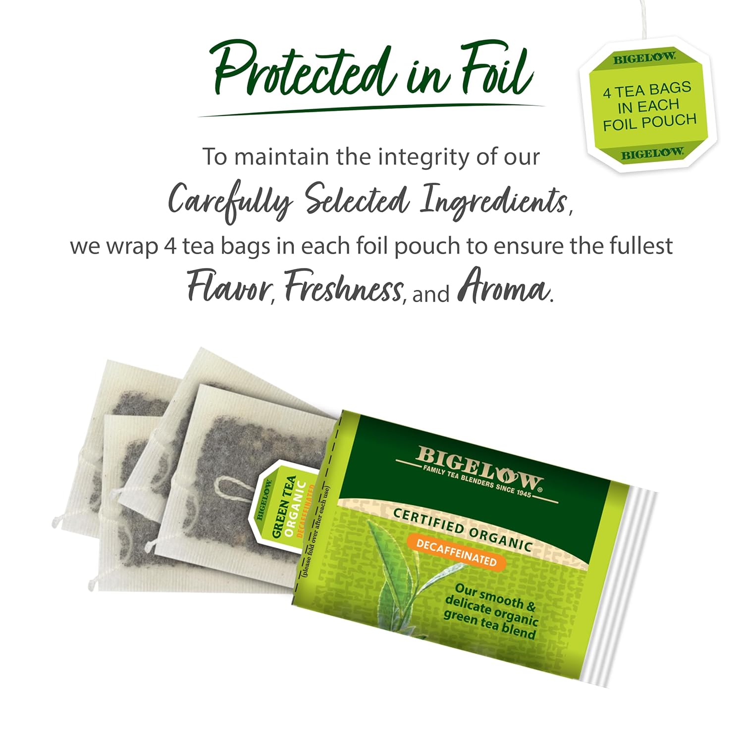 Product Description Bigelow Certified 100% Organic Green Tea is tea with a healthy attitude Mother Nature gave us a wonderful gift when she packed beneficial antioxidants into Green Tea. This certified 100% Organic green tea has the added benefits having been grown by sociallyresponsible farmers who are committed to using only natural fertilizers that are free of synthetic pesticides and additives. Decaffeinated Organic Green Tea offers the same delicious flavor of regular Organic Green Tea in a naturally decaffeinated form. Our natural decaffeination process removes 99.6% of the caffeine without sacrificing flavor or the benefits of green tea. About the Brand The Bigelow Tea Story Beginning the moment our founder, Ruth Campbell Bigelow created "Constant Comment" Tea in her kitchen in 1945, our family has focused on just one thing trying to make the finest teas possible. Over the years we have introduced many new flavors as well as concepts in tea. Today we offer a selection of deliciously different blends of teas and green teas, a wide variety of herbal teas and teas flavored with real fruit juice. Today Bigelow Tea is the number one specialty tea company in the United States. And to think it all began with the first legendary black tea flavored with golden orange rind and sweet spice "Constant Comment"Tea. Bigelow takes immense pride in providing the tea drinking community with the best tea at a great value. We only use hand picked teas, real spices, flavors and herbs. The flavors and blends we have created are second to none. Some of our teas contain up to twenty different ingredients And because tea is a leaf that can dry out we take steps to protect it. To keep the teas fresh, we seal our tea bags in protective packets. We simply have to protect those delightful flavors. Thats why a cup of Bigelow Tea is aromatic and delicious; a true indulgence for the senses. About the Brand The Bigelow® Tea StoryBeginning the moment our founder, Ruth Campbell Bigelow created "Constant Comment"® Tea in her kitchen in 1945, our family has focused on just one thing trying to make the finest teas possible. Over the years we have introduced many new flavors as well as concepts in tea. Today we offer a selection of deliciously different blends of teas and green teas, a wide variety of herbal teas and teas flavored with real fruit juice. Today Bigelow Tea is the number one specialty tea company in the United States. And to think it all began with the first legendary black tea flavored with golden orange rind and sweet spice "Constant Comment"®Tea.Bigelow takes immense pride in providing the tea drinking community with the best tea at a great value. We only use hand- picked teas, real spices, flavors and herbs. The flavors and blends we have created are second to none. Some of our teas contain up to twenty different ingredients! And because tea is a leaf that can dry out we take steps to protect it. To keep the teas fresh, we seal our tea bags in protective packets. We simply have to protect those delightful flavors. Thats why a cup of Bigelow Tea is aromatic and delicious; a true indulgence for the senses.