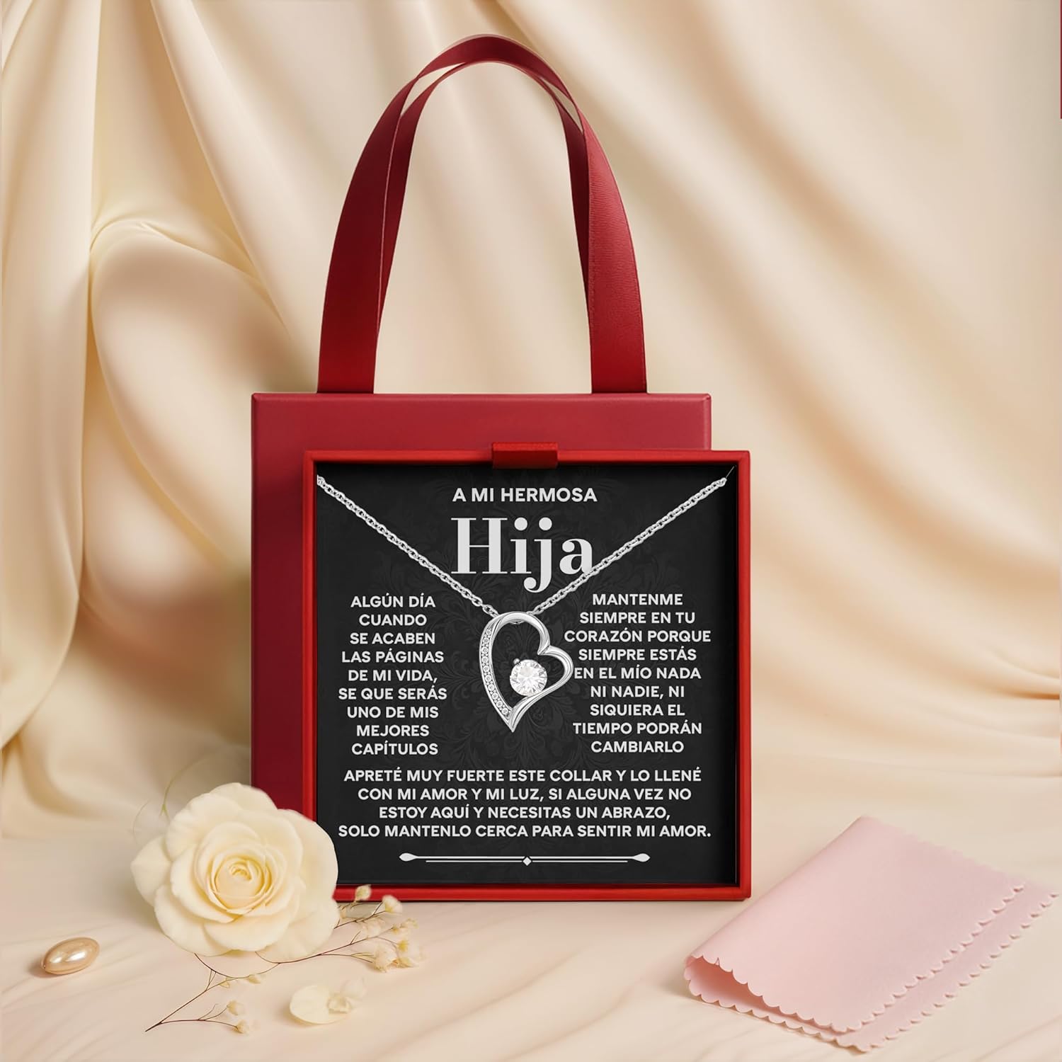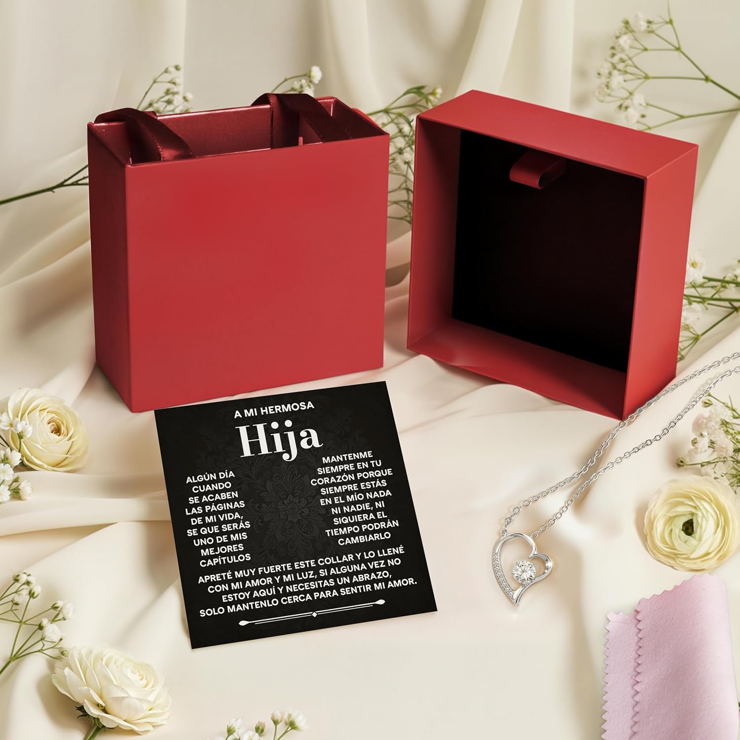 Sorprende a tu hija con este hermoso Collar de Corazón Para Mi Hermosa Hija, collar para mi hija en español, uno de los regalos más buscados por padres que desean expresar amor, orgullo y apoyo incondicional. Su diseño elegante con circonia brillante simboliza luz, protección y un lazo eterno. El mensaje dice: “Algún día, cuando se acaben las páginas de mi vida, sé que serás uno de mis mejores capítulos. Mantenme siempre en tu corazón porque siempre estás en el mío. Nada ni nadie, ni siquiera el tiempo, podrán cambiarlo. Apreté muy fuerte este collar y lo llené con mi amor y mi luz. Si alguna vez no estoy aquí y necesitas un abrazo, solo mantenlo cerca para sentir mi amor.” Este collar es perfecto como regalo de cumpleaños, regalo de graduación, regalo de Navidad, Quinceañera, Primera Comunión, o simplemente como una forma hermosa de recordarle cuánto significa para ti. Presentado en una caja premium, a mi hermosa hija - collar de amor eterno, es un regalo para hija que atesorará por siempre.