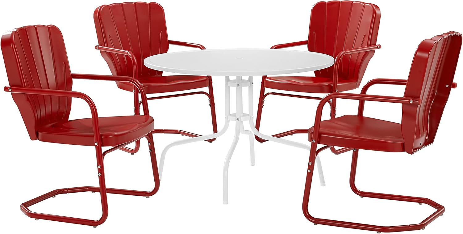 Inspired by the designs of yesteryear, the Ridgeland 5-Piece Dining Set brings class and charm to your outdoor space. Four vintage styled chairs in vibrant colors surround a simple metal dining table for a fun and functional outdoor dining experience. Each chair features a clamshell back with decorative grooves, plus a cantilever base that provides a relaxed seat for dining al fresco.