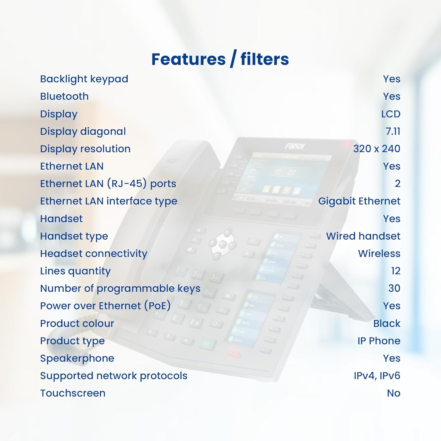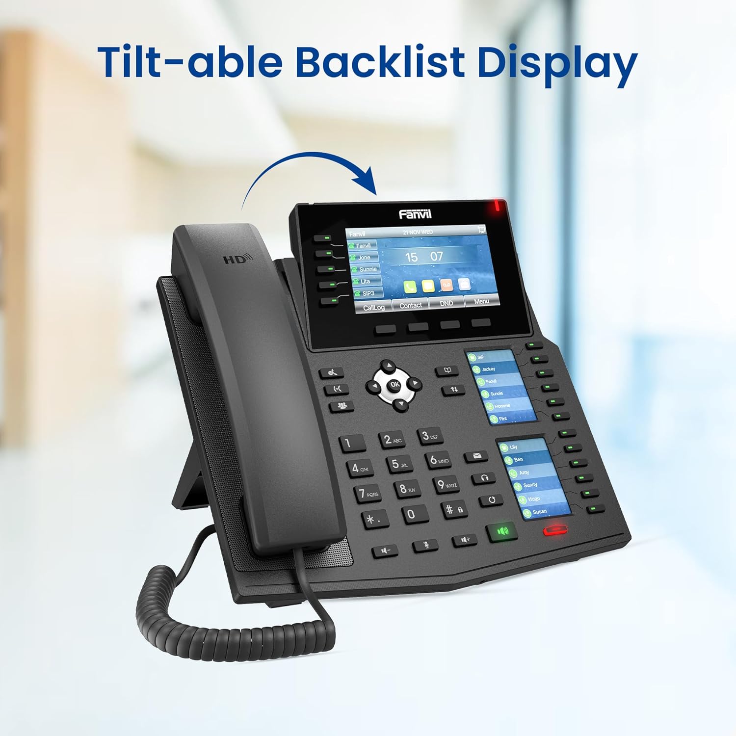 The Fanvil X6U is a high-end IP phone meticulously designed to cater to the dynamic needs of modern businesses. Featuring a combination of advanced hardware and software capabilities, it ensures a seamless and efficient communication experience for professionals. One of the standout features of the X6U is its triple color display setup. The primary 4.3-inch color screen offers a clear and vibrant interface for daily operations, while the two additional 2.4-inch side color displays are dedicated to Direct Station Selection (DSS) keys. This configuration allows for swift access to contacts and functions, significantly enhancing user efficiency. Incorporating newly added line keys with LED indicators, the X6U provides users with immediate visual cues about line statuses. This feature is particularly beneficial in high-traffic environments, enabling quick decision-making and streamlined call handling. The built-in Bluetooth functionality of the X6U further elevates its versatility. Users can effortlessly connect wireless headsets, promoting a hands-free communication experience and reducing desktop clutter. This is especially advantageous for professionals who require mobility within their workspace. Audio quality is a critical aspect of any communication device, and the X6U excels in this domain. With support for wideband codecs such as G.722 and Opus, it delivers high-definition audio, ensuring that every conversation is clear and natural. This superior sound quality minimizes misunderstandings and enhances overall communication effectiveness. Designed with flexibility and productivity in mind, the X6U offers direct access to a range of features and instructions. This design philosophy ensures that the device can adapt to various business scenarios, meeting the diverse demands of different professional environments. In summary, the Fanvil X6U High-End IP Phone is a comprehensive communication solution that combines innovative features with user-centric design. Its triple color displays, enhanced line keys, built-in Bluetooth, and HD audio capabilities make it an ideal choice for businesses seeking to enhance their communication infrastructure.