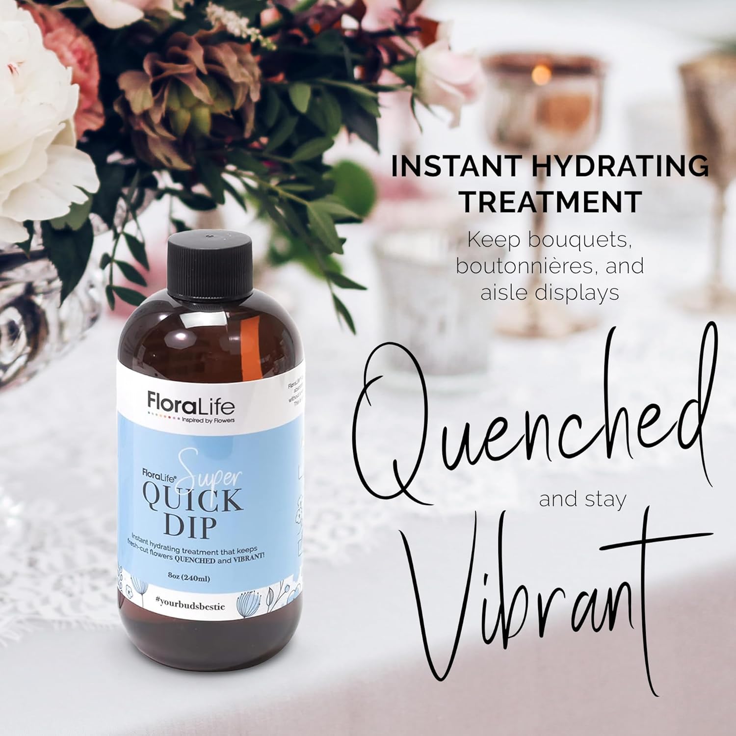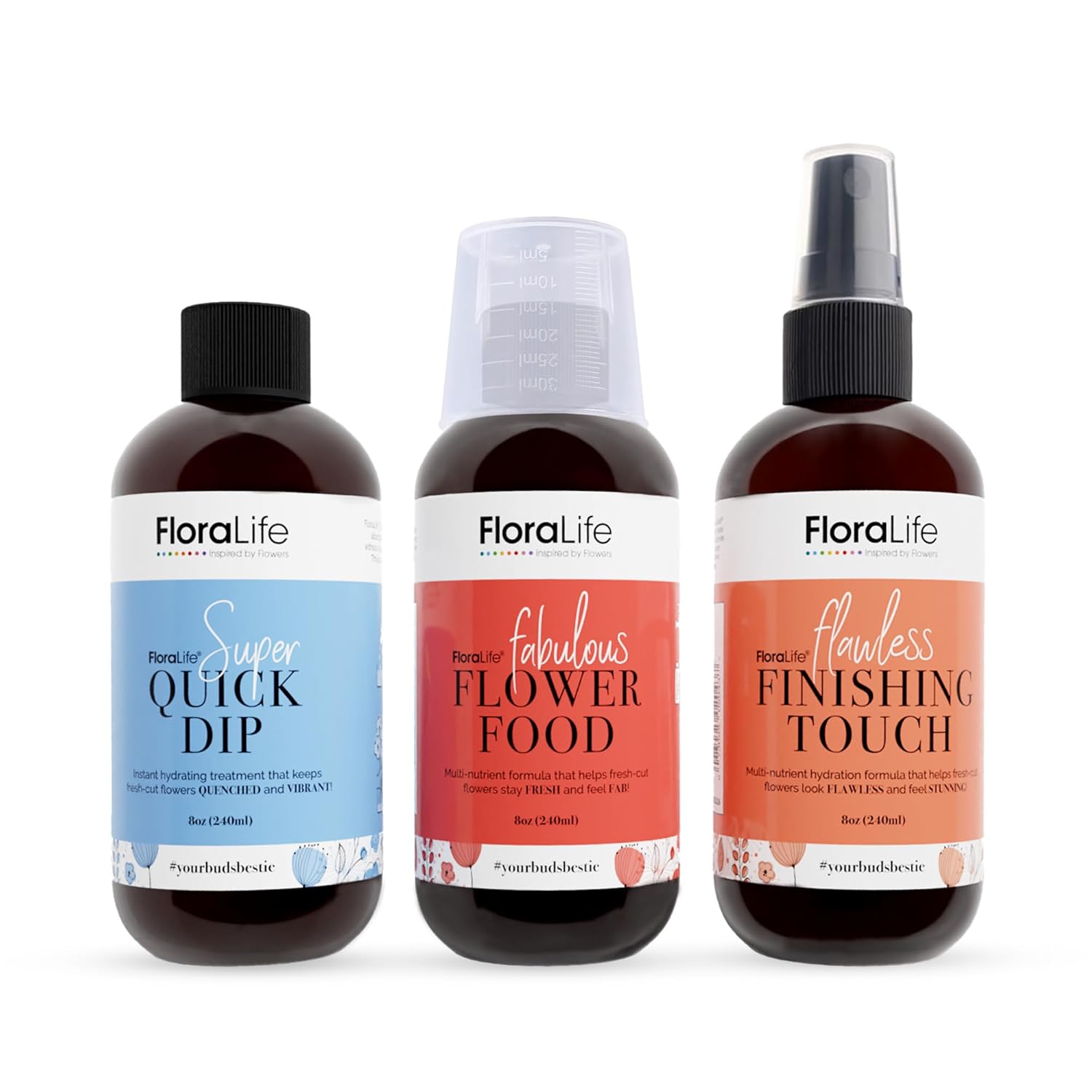 Our Quick Dip, Finishing Touch Spray, and Flower Food bundle will give you everything you need for nurishing and hydrating your fresh cut flowers and bouquets.