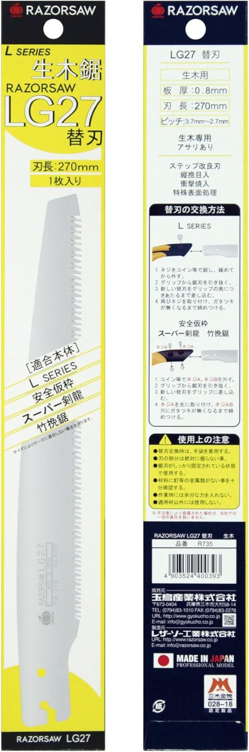 Extra blade fits Razor saw LG27-A Raw tree 270. [Application] Saw for branches, trees and fruit trees. [Features & Function] Super lightweight L series. LG-A Raw tree series come in three sizes of 240, 270, 300. Its "super light weight power fit grip" (ultra light weight 130 g) prevents you from getting tired even after long working hours. Work efficiency has been significantly improved. Portable shear with durable lock function can be stored on either side. It is easy to carry around every worksite, and it is also easy to use. You can open the bottom widely, so there won't be any wood chips or other dust. It has a through hole for the working belt and a belt hook that can be easily installed. [Material] Blade: SK material, Handle: Polypropylene elastomer resin. Gyokucho is the premier Japanese manufacturer of high quality saws with a reputation for reliability and good performance at a modest price. We use a method called impulse hardening to increase the durability of the tooth tips. The hardened saw tooth is much harder than sharpening files so the blade cannot be sharpened and needs to be replaced once it is dull. All products have a name, blade thickness, the blade length, and even the extra blade part number marked on themselves. The marking is done by a laser irradiation method and won't wear off. So even when you lose the package, you can easily identify the products by checking its laser marking. Electro less nickel plating prevents the blade from rusting, and there is no need to worry cutting materials getting dirty with the rust.