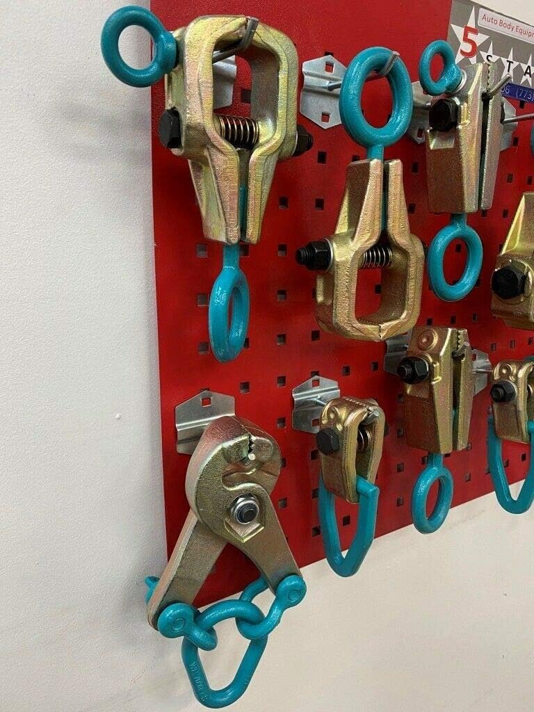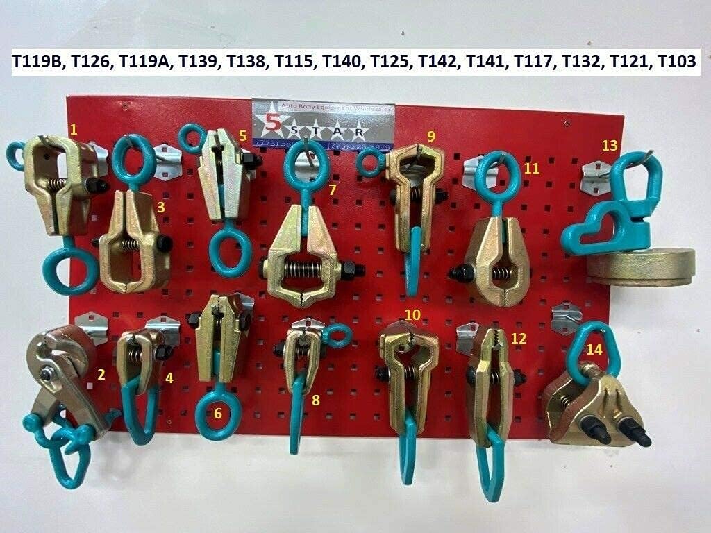 This set comes with: 1) 1 2-way 3 Ton O Clamp Frame Back Self-Tightening Grips & Auto Body Repair Pull Clamp Self-Tightening Pulling Clamp Serrated Jaw Body Frame Repair tool T119B 2) 1 5 Ton Scissor style pulling clamp with looper T126 3) 1 3 Ton "O Clamp" Frame Back Self-Tightening Grips & Auto Body Repair Pull Clamp T119A 4) 1 3 TON Mini Pull Clamp Self-Tightening Grips Auto Body Frame Machine Tool T139 5) 1 5 Ton MO Clamp style 0300 Jr Clamp 2 way Auto Body Frame Machine Repair Pulling Clamp T138 6) 1 Jr. Clamp Mo Clamp Style 5 Ton Auto Body Frame Machine Repair Pull Clamp T115 7) 1 5 Ton Frame Back Self-Tightening Grips & Auto Body Repair Pull Clamp Heavy Duty T140 8) 1 3 TON 2-WAY Mini Pull Clamp Self-Tightening Grips Auto Body Frame Machine Tool T125 9) 1 5 Ton Professional Mo-Clamp style Pulling Clamp C shape Auto Body Frame Machine tools T142 10) 1 5 Ton Professional 2-WAYMo-Clamp style Pulling Clamp C shape Auto Body Frame Machine tools T141 11) 1 Mo-Clamp style, 0200 C Clamp Auto Body Frame Machine clamp tools T117 12) 1 3 Ton Self-tightening single way long nose pull clamp grips T132 13) 1 MO Clamp 2450 Style Shock Strut Tower Puller Clamp Auto Body Frame Machine clamp T121 14) 1 Mo-clamp MCL4030 style Self-Tightening Grip Pull Heavy Duty Clamp T103 Please note that the color of this tool might be different from pictures depending on availability. Either RED, BLUE, TURQUOISE, YELLOW, ORANGE, GOLD, SILVER whichever is available will be shipped out. ☆☆☆☆☆BOARD AND HOOKS NOT INCLUDED BUT CAN BE PURCHASED☆☆☆☆☆ 119B, 126, 119A, 139, 138, 115, 140, 125, 142, 141, 117, 132, 121, 103