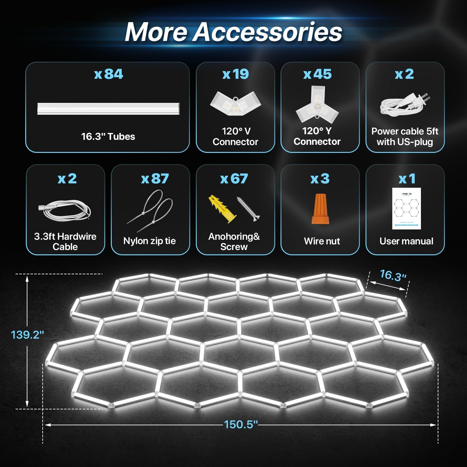 | Included Components | 19* 120° V connector / 45* 120° Y connector, 2* Power cable 5ft with US-plug, 6* Wire nut, 67* Screw/ 67* Anohoring / 87* Nylon zip tie, 84* HYPERLITE Hexagon Garage Light Tubes |