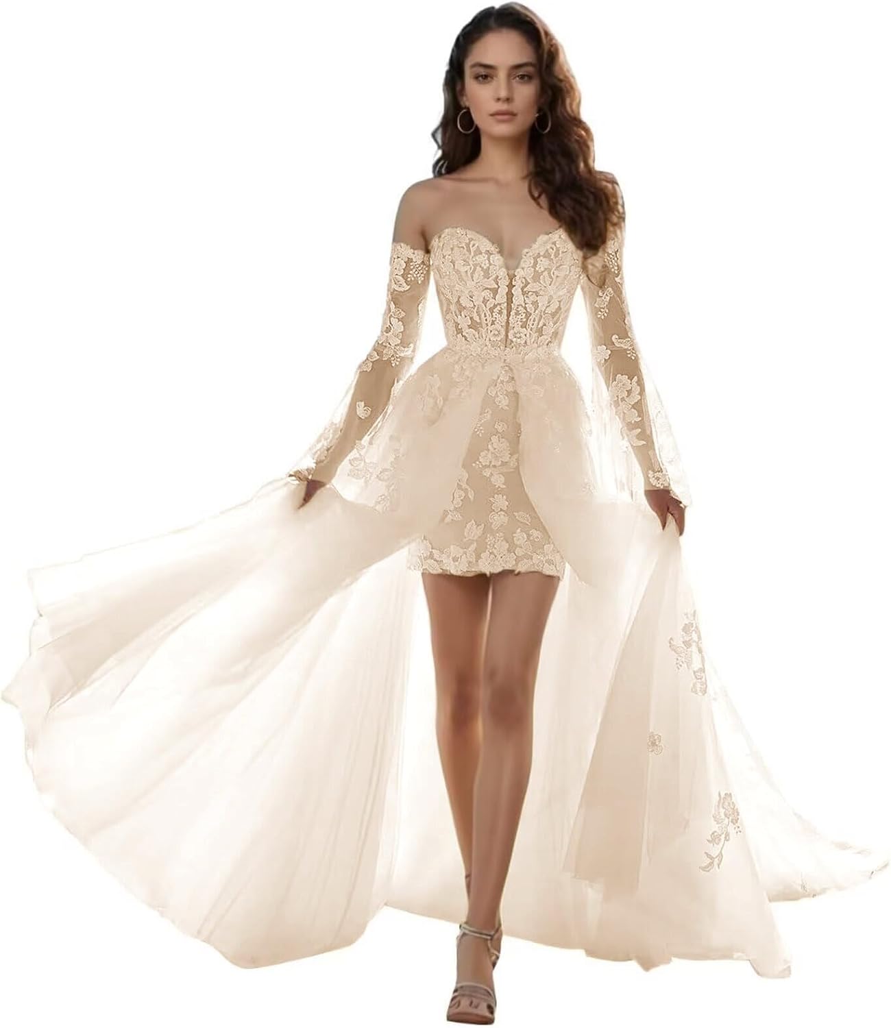 | Embellishment Feature | Strapless lace Applique Boho Mini Bridal Dress, long sleeve wedding dress, mermaid wedding dress, off shoulder wedding dress, tight wedding dresses with sleeves |