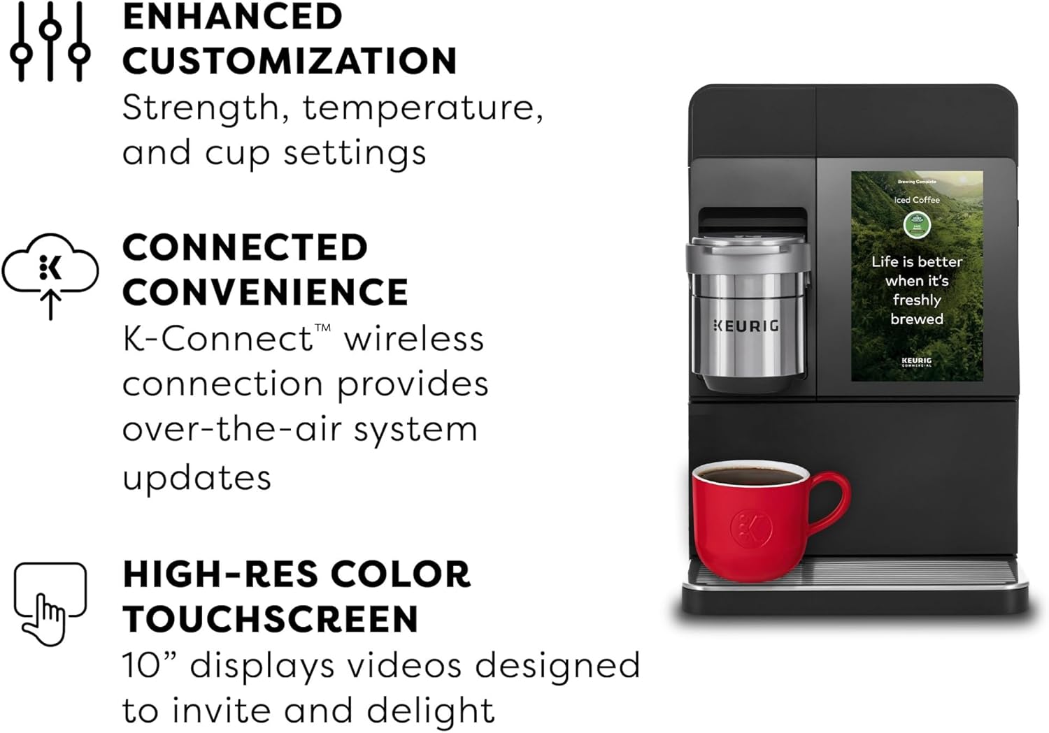 Introducing the K-4500™ Commercial Café System by Keurig ® our most exceptional drinking experience yet. Offer a whole lot more for your large office with two powder hoppers, one for milk and the other for French Vanilla or Chocolate, the K 4500™ can provide over 20 different recipes including flavored coffees, lattes, cappuccinos, and more. With BrewID ™ for specialty beverages, the K 4500™ recognizes your K Cup® pod and suggests customized brew settings to make each cup distinctively delicious. You can customize your perfect cup even further with multiple settings for strength, temperature, and cup size. The K-4500™ has been engineered and developed for high traffic areas with back to back brewing to reduce any down time between brews. No more waiting in line to get your coffee at the café; come discover the next generation of Keurig® brewing.