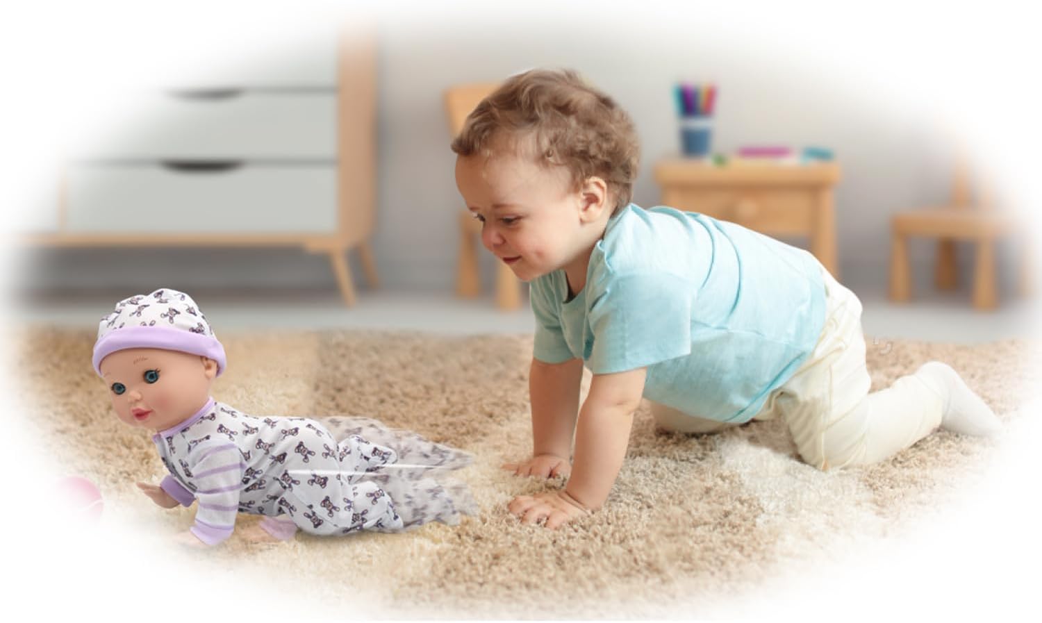 Your little one will love watching their adorable baby crawl all on her own with the Little Darlings 10" Crawling Baby Doll Playset. Simply wave your hand near the baby's face and watch her crawl on her own as she giggles & coos or chase after her ball and play bottles. It's all about imaginative fun. Includes 10" baby doll with removable outfit, ball and 2 play bottles to make sure she is clean and happy as a smiling baby can be! Perfect for ages 2 and up. This doll comes with 2-AA batteries that can be easily replaced when needed.