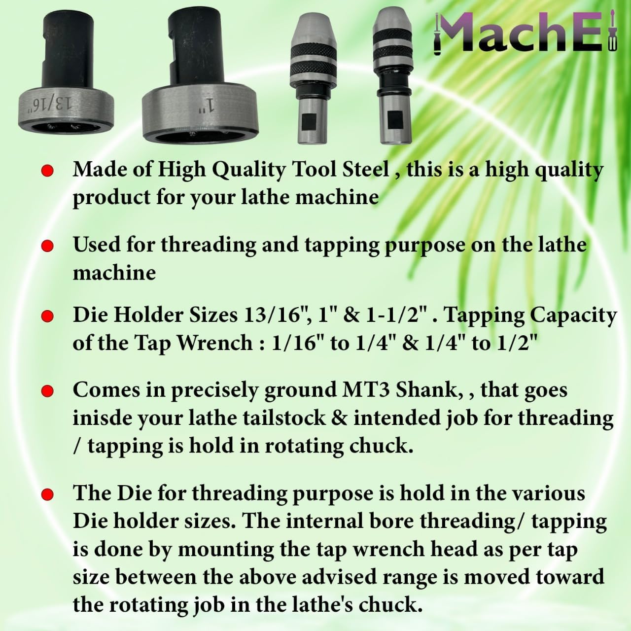 The Machel Tapping, Reaming & Threading Die Holder Set For Lathe Tailstock (MT3) Is A Versatile And Precision Tool Designed For Thread Cutting, Tapping, And Reaming Operations In Metalworking Applications. This Tool Is Ideal For Manual Lathes, Drilling Machines, And Milling Machines, Ensuring Accurate Alignment And Smooth Machining Performance. Featuring A MT3 Morse Taper Shank, The Holder Fits Securely Into Lathe Tailstocks, Allowing Stable And Controlled Tapping And Threading Operations. The Design Helps Maintain Proper Alignment Between The Cutting Tool And Workpiece, Reducing The Risk Of Thread Damage And Improving Machining Accuracy. This Lathe Tailstock Tapping And Die Holder Set Supports Multiple Threading Die Sizes Including 1 Inch And 13/16" Dies, Making It Suitable For A Wide Range Of Thread Cutting Tasks In Engineering Workshops And Manufacturing Environments. Manufactured From Hardened Tool Steel, The Holder Set Provides Excellent Durability, Wear Resistance, And Long-lasting Performance Even In Demanding Machining Conditions. The Machel MT3 Tapping And Die Holder Is Widely Used By Machinists, Tool Makers, Fabrication Workshops, Maintenance Departments, And Industrial Manufacturing Units For Precise Threading, Tapping, And Reaming Operations.