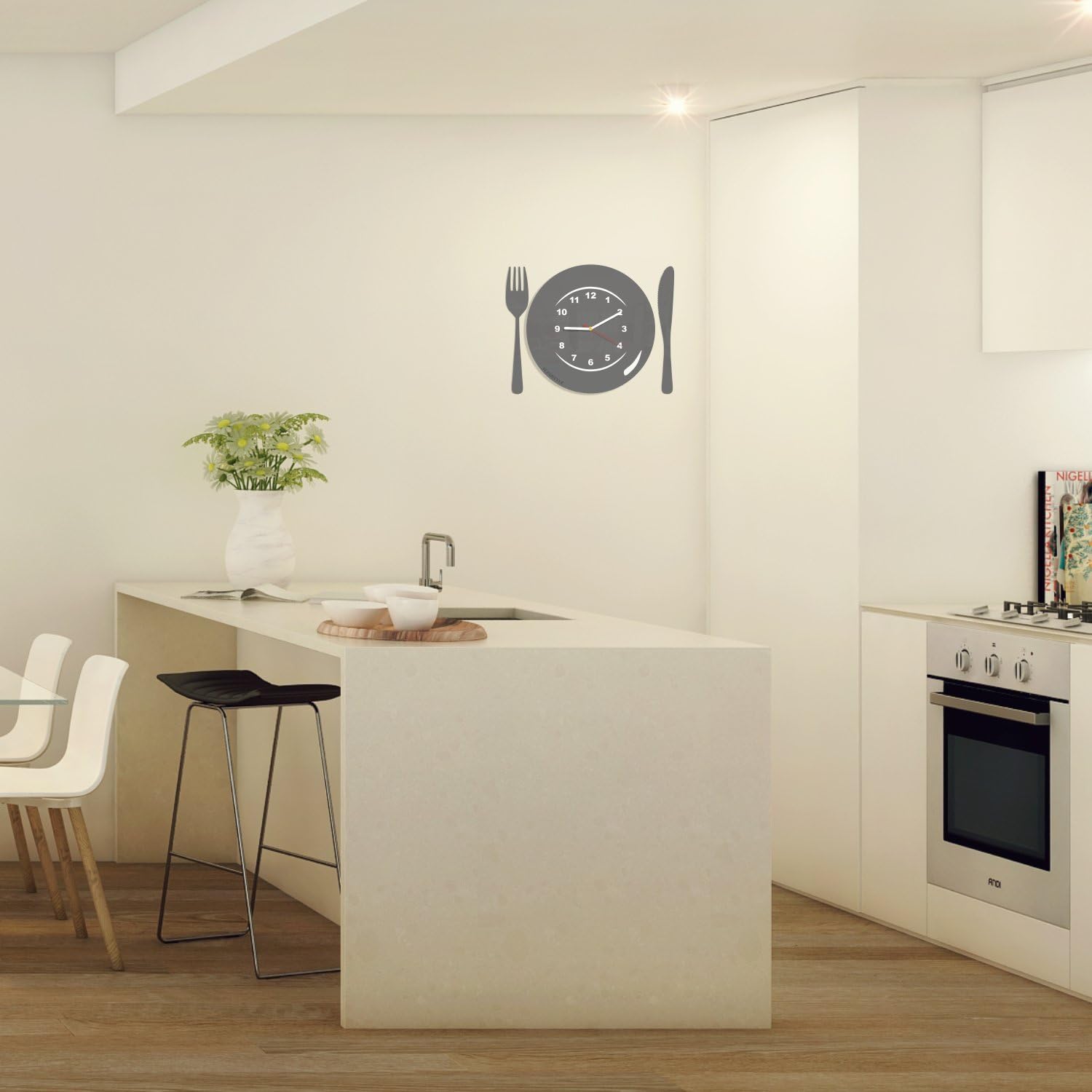 Modern design kitchen wall clock. Kitchen clock with dish design, recommended for kitchen and dining room. Plate dial with fork and knife. Fork and knife made with the same material as the clock. Built-in adhesive tape on the back for wall installation. 1.5V AA battery included. Size: Dial: 27 x 27 cm. Thickness: 3 mm. Hand length: 5 cm; minutes and seconds: 9 cm. Clock movement. Precise movement without ticking. No canvas effect. The clock can be installed in the bedroom. Good quality AA battery included. Material: high gloss acrylic glass (PMMA) clock. The glass looks real, but it is lighter and safer. Made in the EU. Design and manufacture: EU - - -