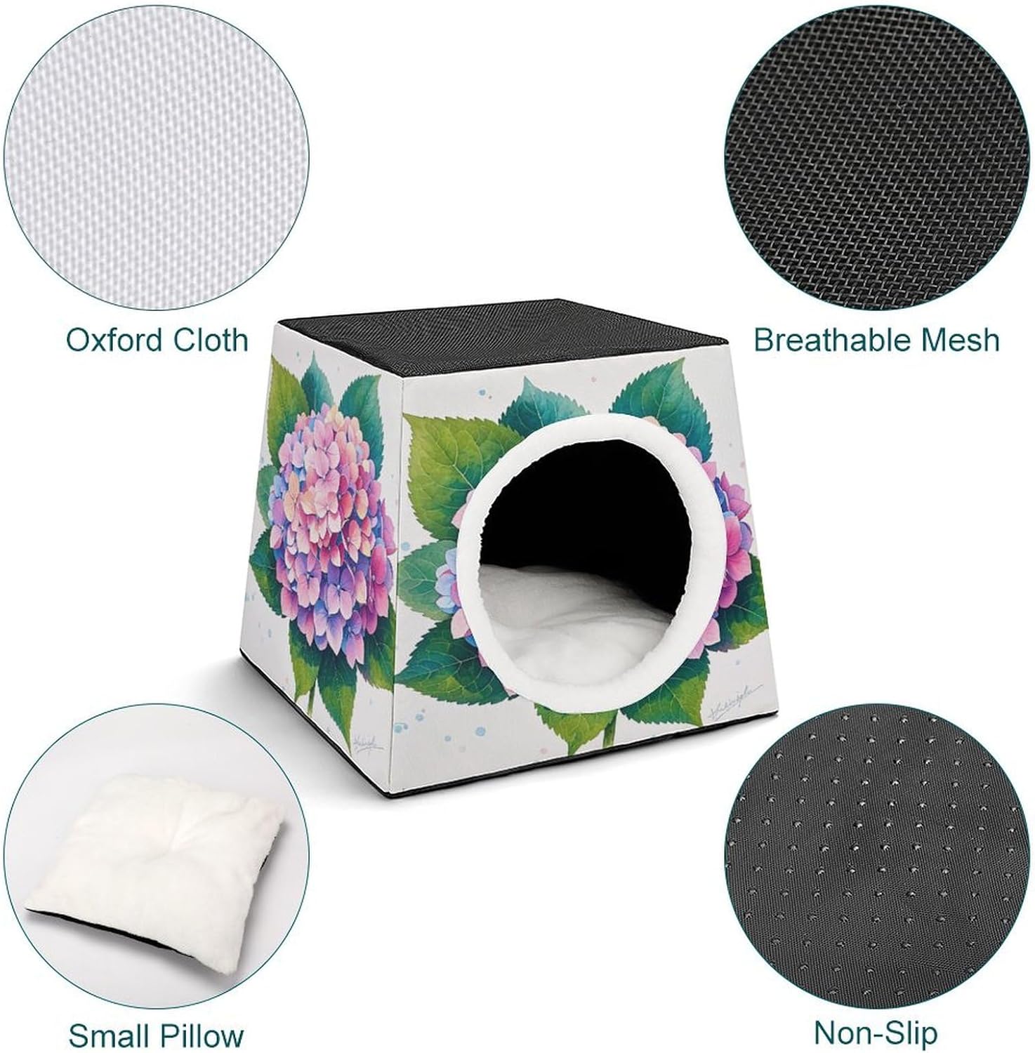 Portable Pet Nest Can Make Pets Sleep More Comfortably. Watercolor Hydrangea printed Dog Cave Bed Can Also Serve As A Decorative Element In Homes. The Mats At Winter Pet House Are Soft And Comfortable. The Spacious Design Of Warm Pet Cave Provides Ample Room For Small Animals To Stretch