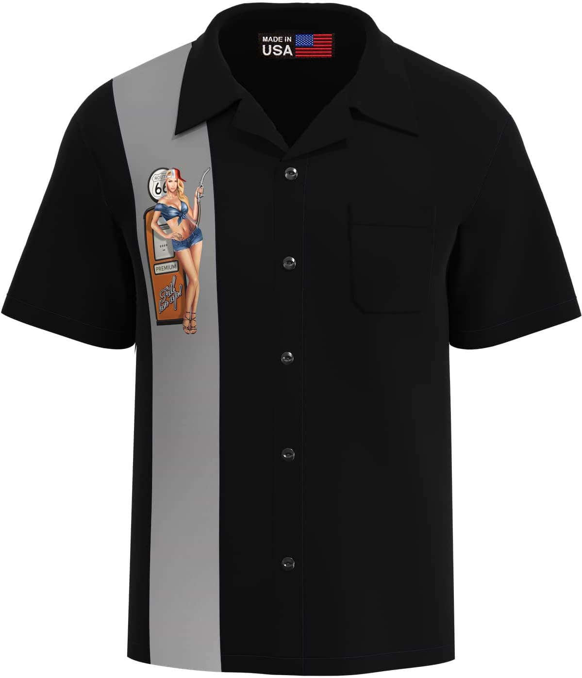 Have a sexy Route 66 calendar pin up girl on your shoulder for a road trip or fun in your hometown sipping' a cocktail. Mens Black Rockabilly Shirt with Beautiful PinUp Girl Printed Grey Single Panel, Left Chest Pocket, Button Up made from easy care polyester. This stylish 40's pin up girl button down shirt is a fabulous addition to your wardrobe. "True to Fit Size" Not oversized
