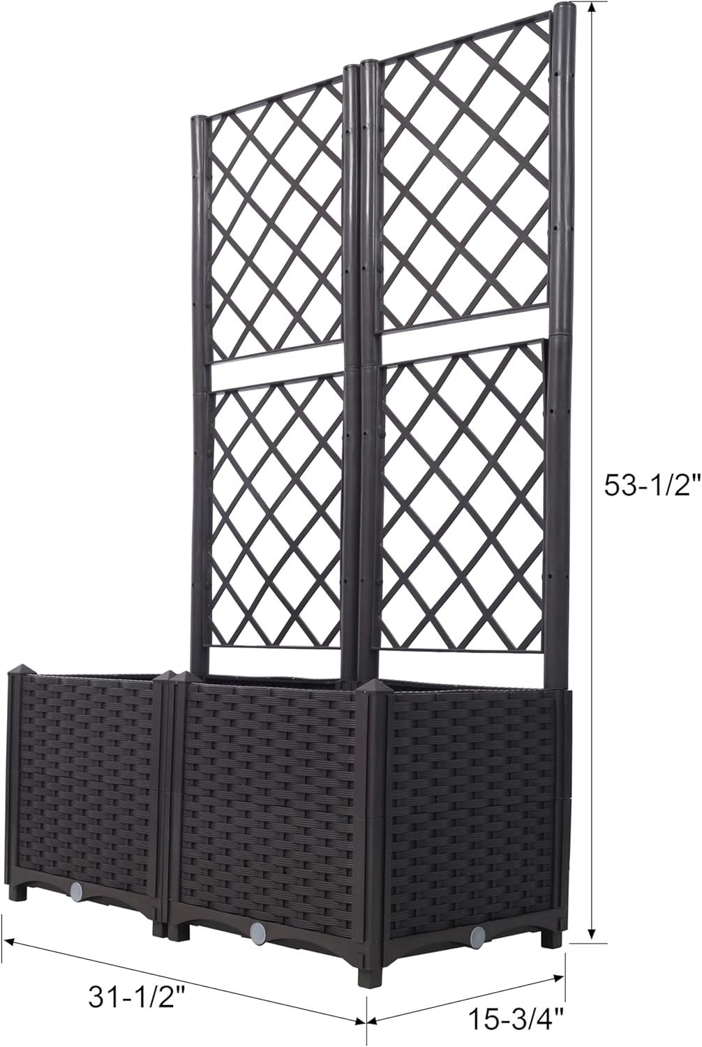 Create a thriving vertical garden anywhere with this Raised Garden Bed with Detachable Trellis & Drainage Plug, designed to support climbing plants and maximize growing space even in compact outdoor areas. This planter box offers a deep growing area for vegetables, herbs, flowers, and greenery, while the included trellis provides strong, upright support for vine crops such as tomatoes, cucumbers, beans, peas, and decorative climbing plants. Crafted from premium, weather-resistant plastic, the raised garden bed is built to withstand outdoor exposure without cracking, fading, or rusting, ensuring years of reliable gardening use. The elevated height promotes comfortable gardening by reducing bending and kneeling. An integrated drainage plug helps regulate water flow, preventing overwatering and maintaining optimal soil moisture for healthier roots. Product Type: Raised Garden Bed with Detachable Trellis Material: Plastic Trellis: Removable, supportive lattice for climbing plants Drainage: Built-in drainage plug Placement: Patio, balcony, garden, backyard, deck Best For: Vegetables, flowers, herbs, climbing plants, vine crops Assembly: Simple, tool-free setup Design: Modern vertical garden planter Product Dimensions & Weight: 31.50"x15.70"x53.50", 9.20lbs Package Dimensions & Weight: 19.70"x23.20"x7.50", 16.90lbs