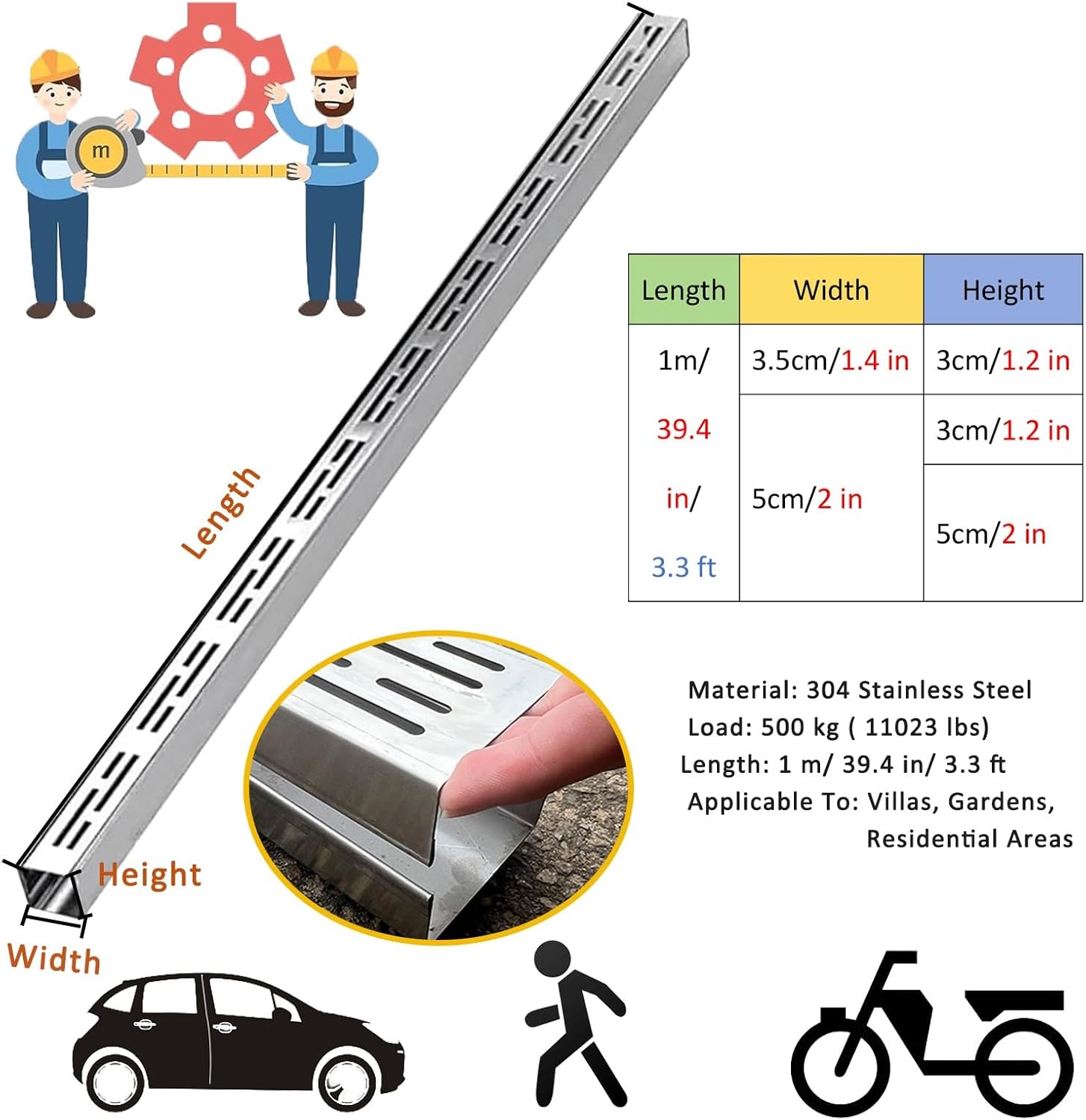 Introducing our premium Drain Grates, engineered for durability and long-lasting performance. Crafted from high-quality 304 stainless steel, these grates not only enhance the aesthetics of your garden, driveway, or home but also ensure a clean and efficient drainage system. **Key Features:** 1. **Efficient Water Discharge:** Our stainless steel channel drain is designed to effectively channel water away, minimizing the risk of blockages. This feature is essential for preventing water accumulation and maintaining a dry environment in your outdoor spaces. 2. **Smart Design:** The narrow and elongated holes in our trench drain are specifically engineered to prevent leaves and small debris from clogging your drainage system. This means less maintenance and more time enjoying your outdoor areas. 3. **Versatile Applications:** Ideal for various settings such as patios, decks, gardens, and backyards, our drain grates are perfect for managing stormwater and preventing pooling in areas where water tends to collect. 4. **Easy Maintenance:** With a user-friendly design, cleaning and maintaining your drain grates is a breeze. Simply remove the cover and rinse to keep your drainage system functioning optimally. **Specifications:** - **Material:** 304 Stainless Steel - **Color:** Silver - **Load Capacity:** 11,023 lbs - **Sizes Available:** - 1.4x1.2 inches - 2x1.2 inches - 2x2 inches **Package Includes:** 1 x Drain Trench (with bottom trench and drain cover) Please note: Due to manual measurement, there may be a slight variance of 1-3 cm. Additionally, color discrepancies may occur between the product and display due to lighting conditions. Upgrade your drainage solutions with our reliable Drain Grates, ensuring your outdoor areas remain functional and visually appealing.