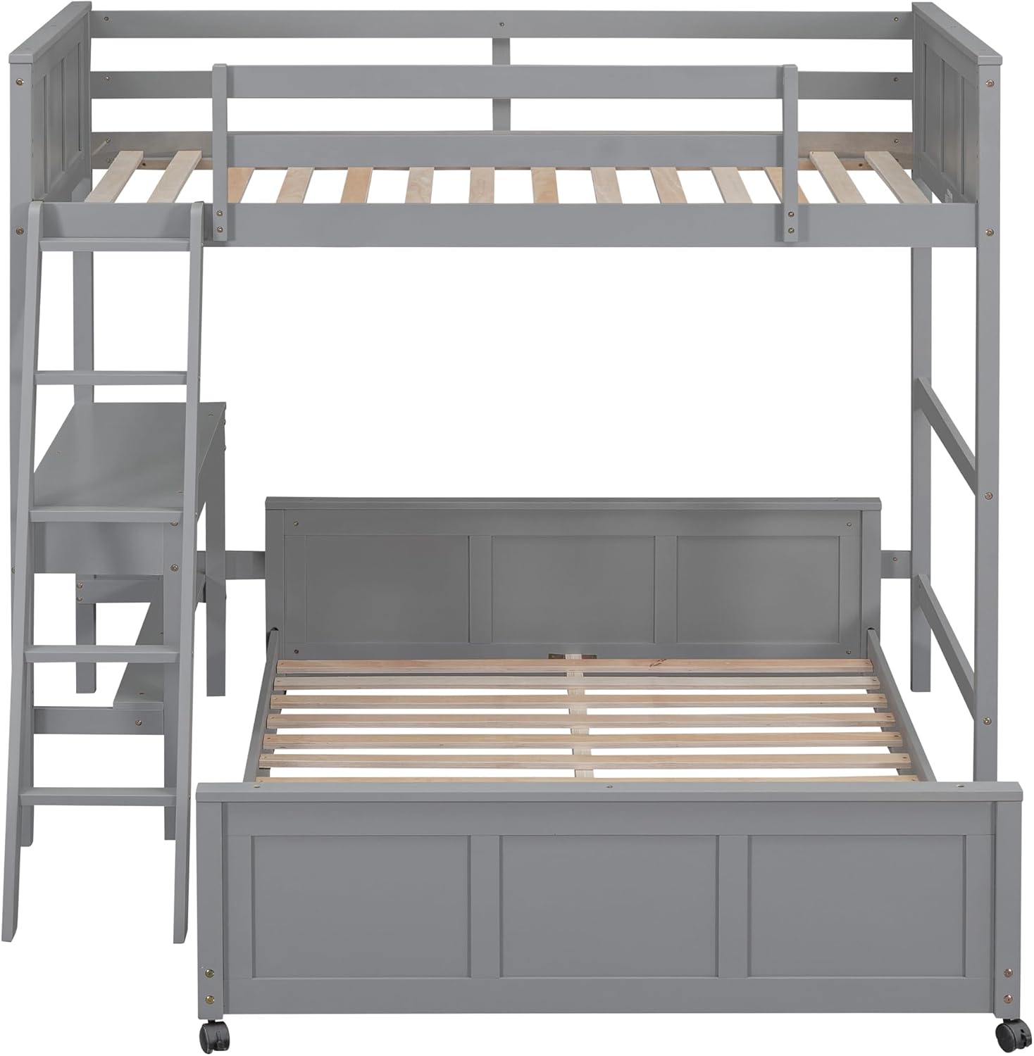 If you need extra sleeping space, this lovely Bunk Bed is perfect for your home. High-quality, solid pine legs and a strong, durable frame ensures stability and durability for long-term use. The desk underneath the bed provides great convenience for you to work and study.Slat kit included so box springs are not required. This bunk bed is designed with a clean silhouette and a hue of elegance. It suits all styles of home decoration, and completes the look of any bedroom. Weight & Dimensions Overall Product Dimension : 79.5"L x 42"W x 68.3"H Detail Product Dimension: Please refer to the Size image Number of Package: 2 Package Dimension: Package one: 57.87 * 19.09 * 7.48 in. 79.37 lbs. Package two: 80.31 * 16.73 * 5.31 in. 93.7 lbs. Overall Product Weight: 159.84 LBS Weight Capacity: Upper bed:300 lbs Bottom bed:350 lbs Recommended Mattress Thickness: Upper bed:6 inch Bottom bed:6-8 inch Recommended age: > 6 years old Specifications Product Type : Bunk Bed Size: Twin Over Full Color: Gray/White Material: Plywood+MDF+Pinewood The number of slats: 14 Assembly Required: Yes Country of Origin: Vietnam