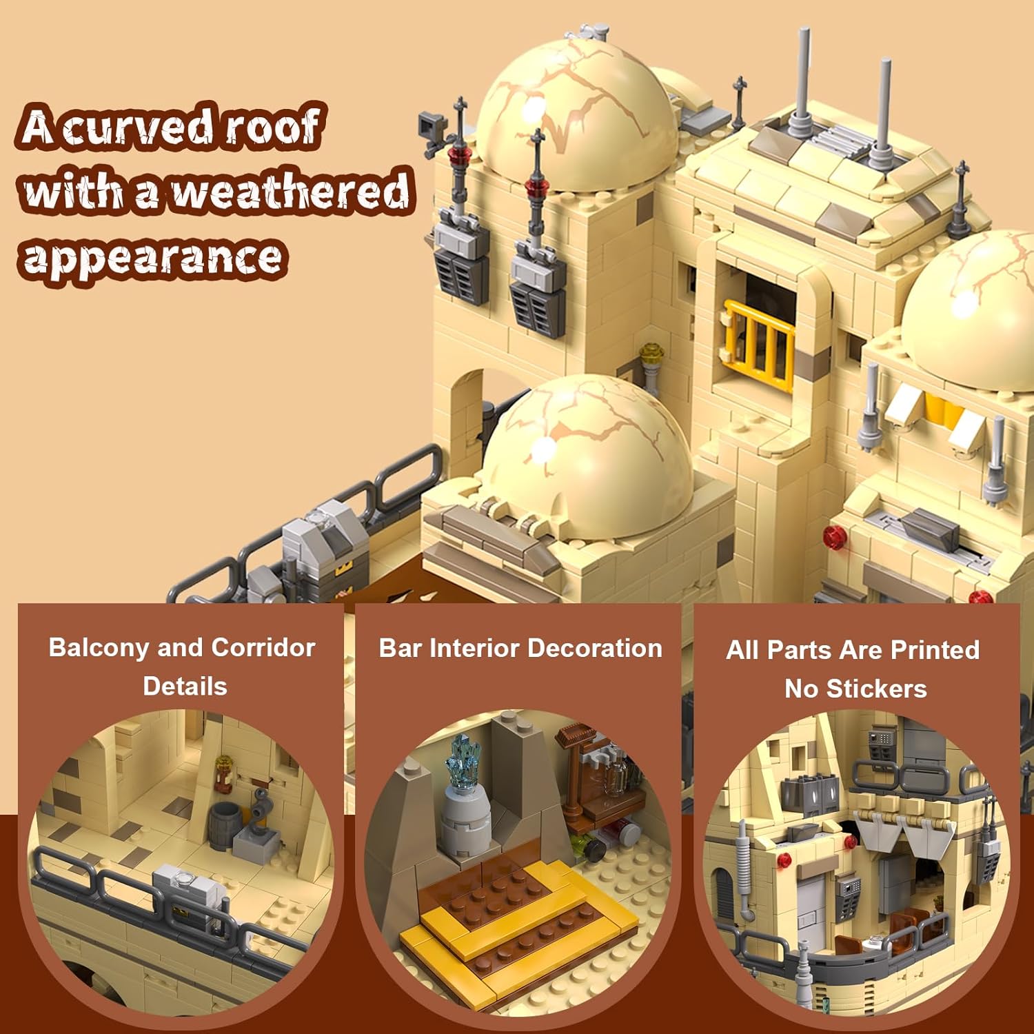 Immerse yourself in the world of space wars with the Tatooine Cantina Modular House Building set for adults. This intricate Tatooine desert house model, featuring 2731 premium ABS bricks, masterfully recreates a classic cantina's unique architecture from the Movie. The multi level, detachable house kit boasts a massive dome, a towering communications array, and authentic details like sensor dishes and red warning lights. The interior includes a detailed bar on the first floor and seating areas upstairs. This highly detailed building set for adults and Space Wars movie sets vintage collection collectors, comes with a beautiful gift box and clear, steps instructions. Finished dimensions: 27x27.5x34cm.