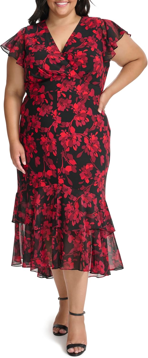 This Tommy Hilfiger Women's Dresses Midi is a Flutter Sleeves V Neck Empire Soiree Swirls Foil Printed Jersey Tiered Flutter Hem