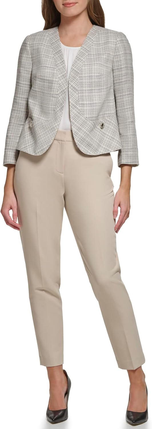 This Tommy Hilfiger Women's Jacket is a fitted open front blazer in a plaid fabric with pockets at the front