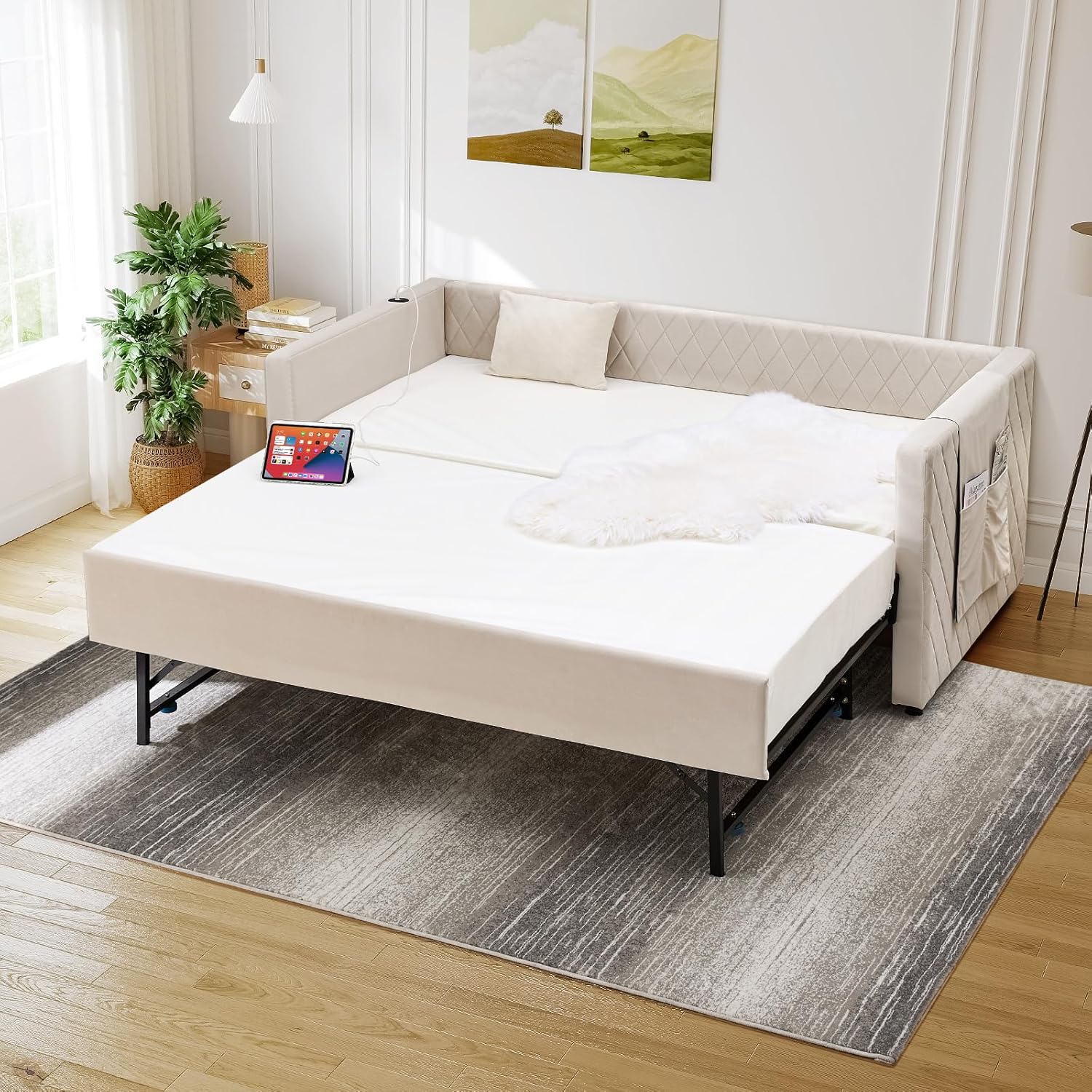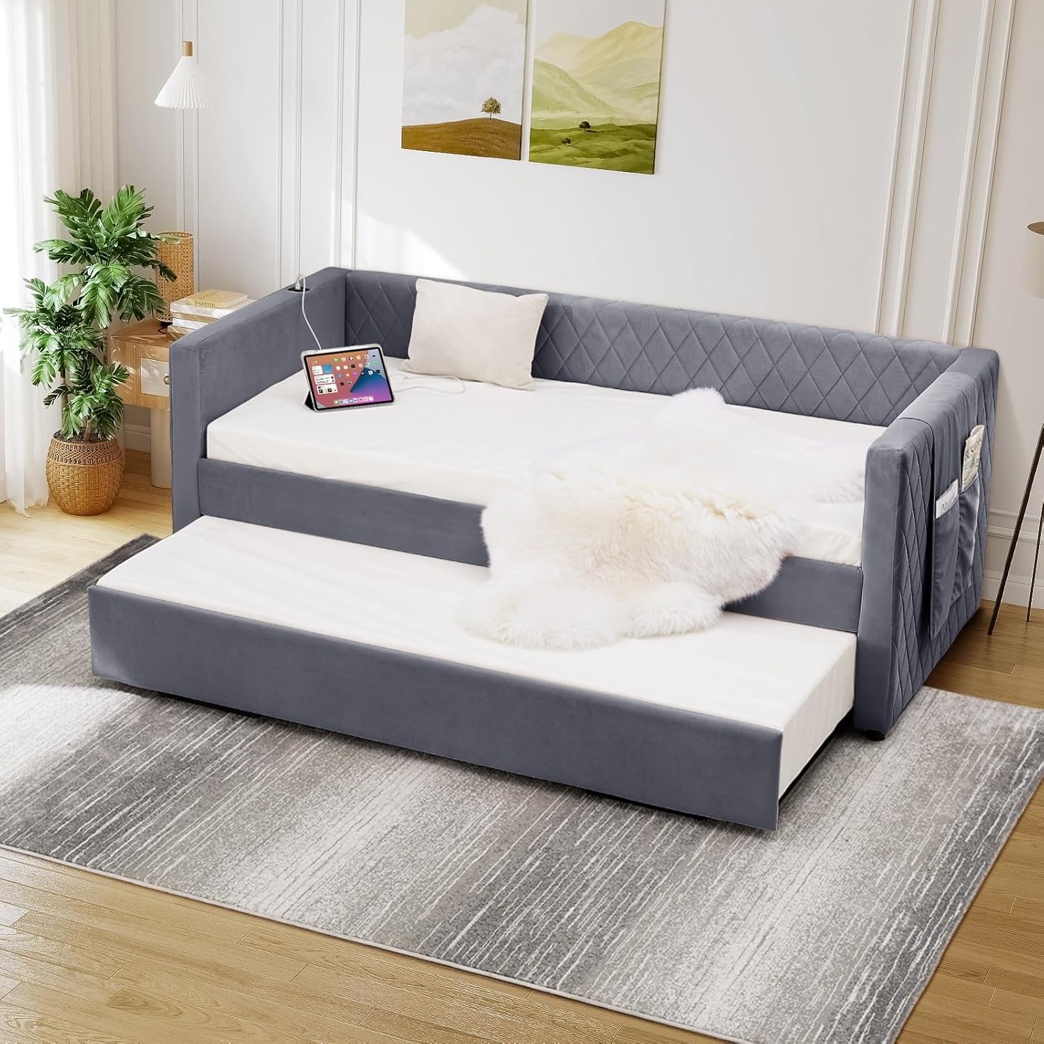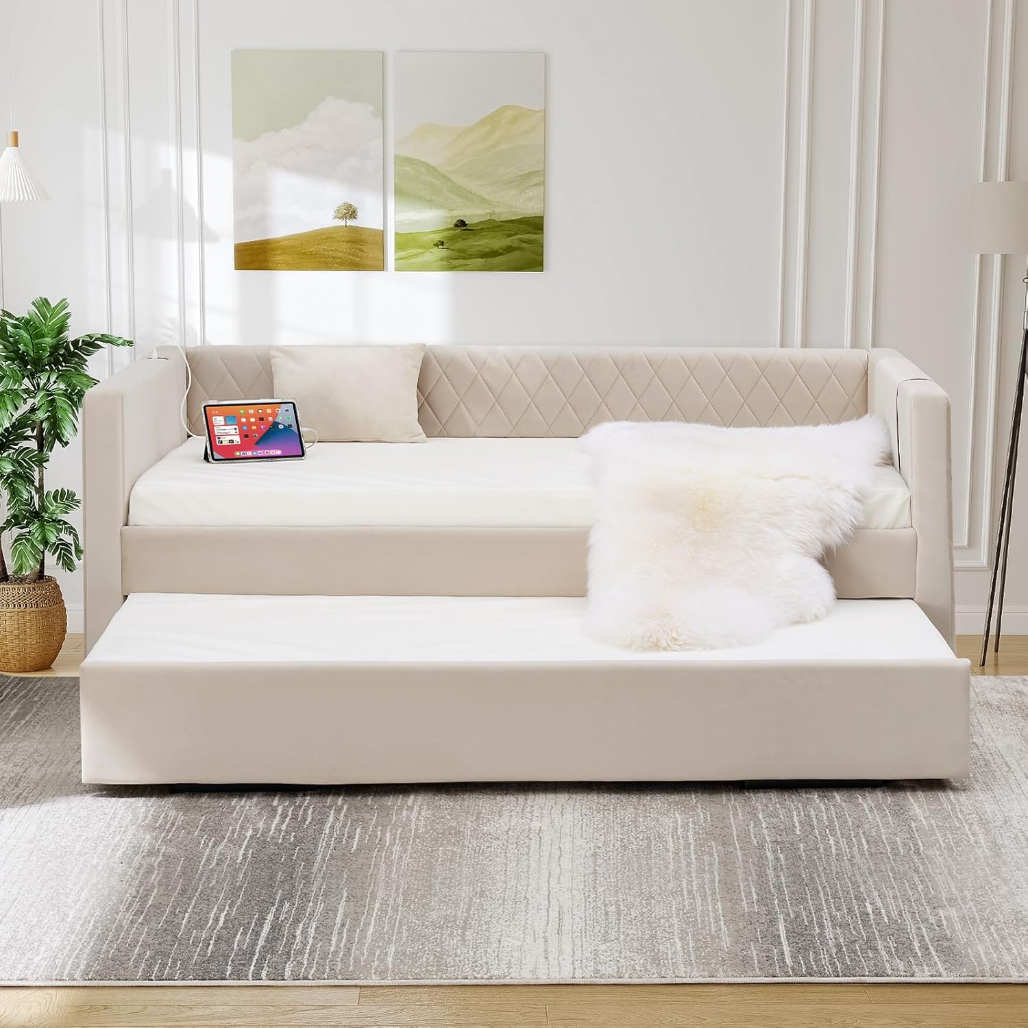 Modern Velvet Daybed with Pull-Out Bed Trundle - Space-Saving Twin Sleeper Sofa for Bedroom & Living RoomElevate your space with our stylish and functional velvet daybed. Featuring a chic diamond grid design and a convenient pull-out trundle, this piece is the multifunctional solution for your bedroom, living room, dorm, or guest room. It effortlessly combines a comfortable sitting area by day with a spacious sleeping area by night, making it ideal for small spaces and stylish homes alike.Specifications: Upholstery Material: Premium Soft Velvet Frame Material: Engineered MDF Wood Overall Dimensions: 83.1" L x 41" W x 31.5" H Recommended Mattress Size (Both): Twin (75" L x 39" W) Recommended Mattress Thickness: 6-8 inches Weight Capacity (Daybed): 250 lbs Number of Packages: 2 Assembly: Required (Tools & instructions included)Ideal For: Small Apartments Condos Guest Rooms Studios Dorms Living Rooms Reading NooksUpgrade your home with the perfect blend of fashion and function. Add to Cart today!