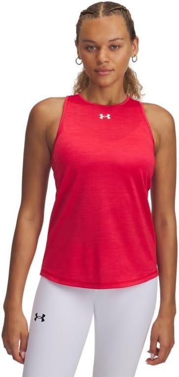 The Under Armour Women's Tech Vent Team Tank is a top-tier piece of athletic apparel designed for maximum comfort and flexibility. Engineered with a 4-way stretch material, this tank moves better in every direction, offering unparalleled freedom that matches every move you make. Whether you're working out at the gym, going for a run, or practicing yoga, this tank top enhances your performance by allowing fluid, unrestricted movement. A standout feature of this tank top is the mesh back panel, which increases the garment's overall breathability. This design element works in conjunction with the ultra-breathable knit fabric to keep you cool during intense workout sessions. The super-lightweight material ensures you hardly feel the weight of the tank, enhancing your comfort and ease of movement. One of the primary benefits of the Under Armour Women's Tech Vent Team Tank is its superior sweat-wicking property. The material is designed to wick sweat away from your body and dry really fast, keeping you dry and comfortable even during the most strenuous workouts. This feature is a game-changer for athletes and fitness enthusiasts who engage in high-intensity exercises and need their apparel to keep up with them. The tank top also features a dropped, shaped hem for enhanced coverage. This thoughtful design detail ensures you stay covered, providing a confident and comfortable fit throughout your workout. The Women's Tech Vent Team Tank aligns perfectly with Under Armour's commitment to quality, performance, and style. It's available in a variety of colors, so you can choose the one that best matches your style or workout gear. This tank is more than just an athletic wear—it's a testament to Under Armour's innovative spirit and unwavering commitment to helping athletes perform their best
