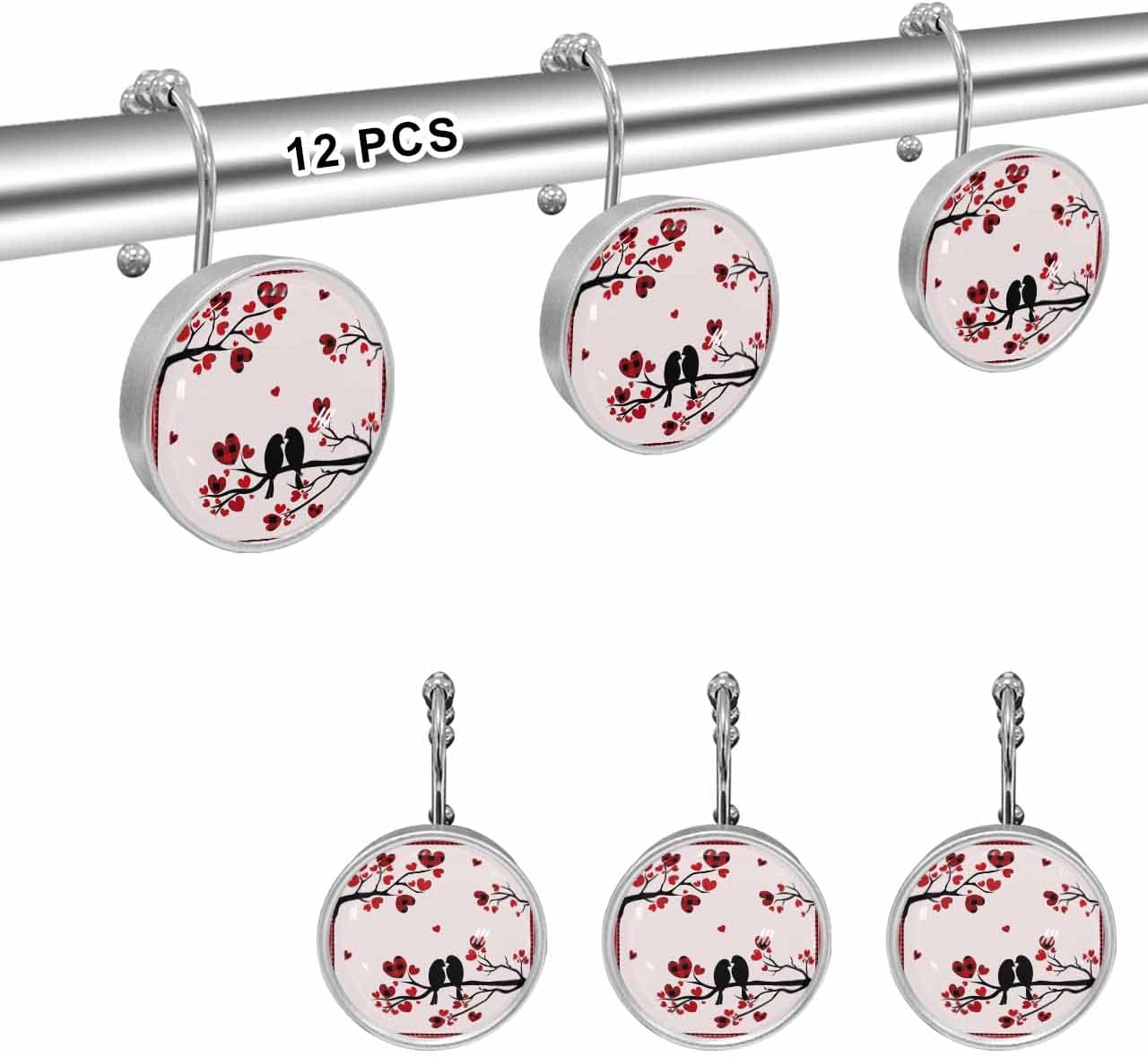Steel Shower Curtain Hangers: The decorative shower curtain rings/hook made of stainless steel with plating surface, rust-resistant, not easy to fade, smooth, low noise, strong and durable.Set of 12 Shower Hooks: The 12-pcs shower curtain hooks set. Fits standard size shower rods. Shower curtain sold separately.Glides Easily: 5 small roller balls at the top of the rings to reduce friction, allowing the hooks to make sliding on the rod effortlessSay Goodbye to Falling: Provided anti falling metal ball for its tail, the hook can slide smoothly on the shower curtain rod.Great Gift: This easy to install shower hooks for shower curtain are coordinates with many homes' bathroom decor sets. They are creative and great useful gifts for friends, family.Wide Range of Uses: Shower hooks are not only suitable for shower curtains, but also for hanging towels, pots and pans, coffee cups, clothes, and plants in bathrooms, kitchens, bedrooms, offices and gardens.Customer Service: If there is anything problem, please feel free to contact with us, we will reply to your email within 24 hours and do our best to solve your problem.