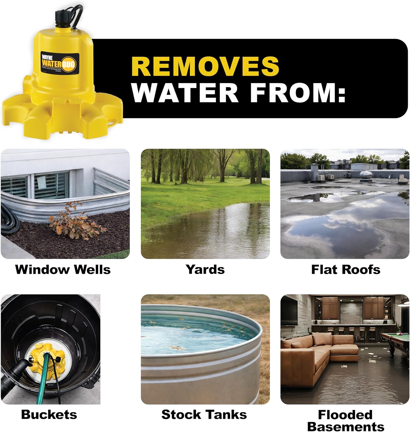 The Wayne WWB waterbug submersible water removal pump with multi-flo technology, is the perfect transfer pump for multiple applications. Featuring a unique multi-flow technology that allows for top and side discharge, the WWB is perfect for tight spaces and easy water removal from flat surfaces. The waterbug keeps surfaces virtually dry, by removing water down to 1/16 of an in. Easily store the pump away, with the easy hang tab feature.