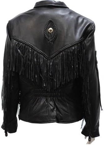 Women's leather motorcycle jacket with fringe, conchos, zip out lining, braid, side laces and gathered back. Women's motorcycle jackets have fashionable diamond shaped braid surrounding the conchos and are made from top grade leather. Jacket features a zip out lining that runs through the sleeves. For Jackets best fit, order by chest size.