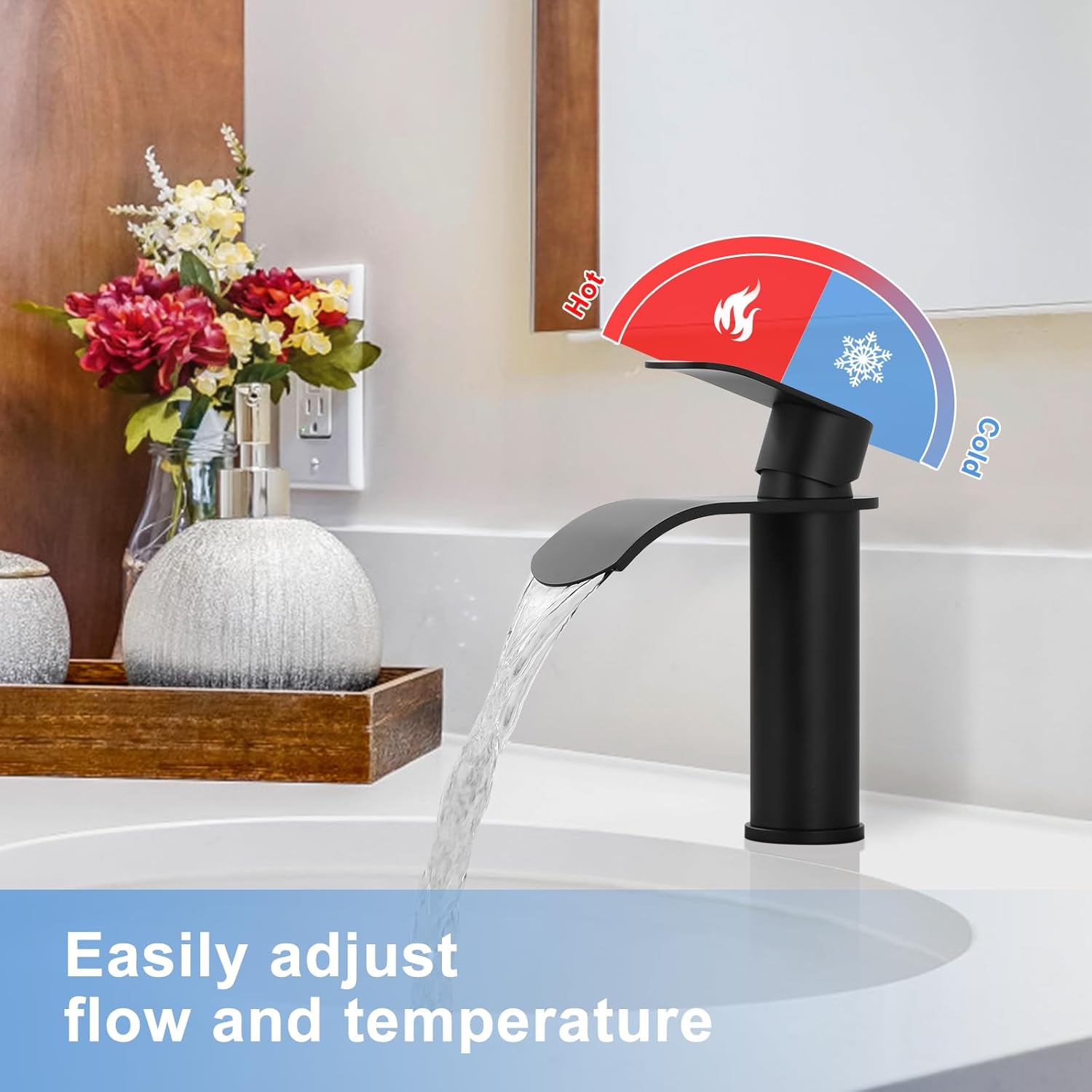 WOWOW Waterfall Bathroom Faucet, Matte Black Bathroom Sink Faucet for 1 Hole or 3 Holes and Black Kitchen Faucet, Pull Down Kitchen Faucet Stainless Steel Gooseneck Kitchen Sink Faucet Single Handle W