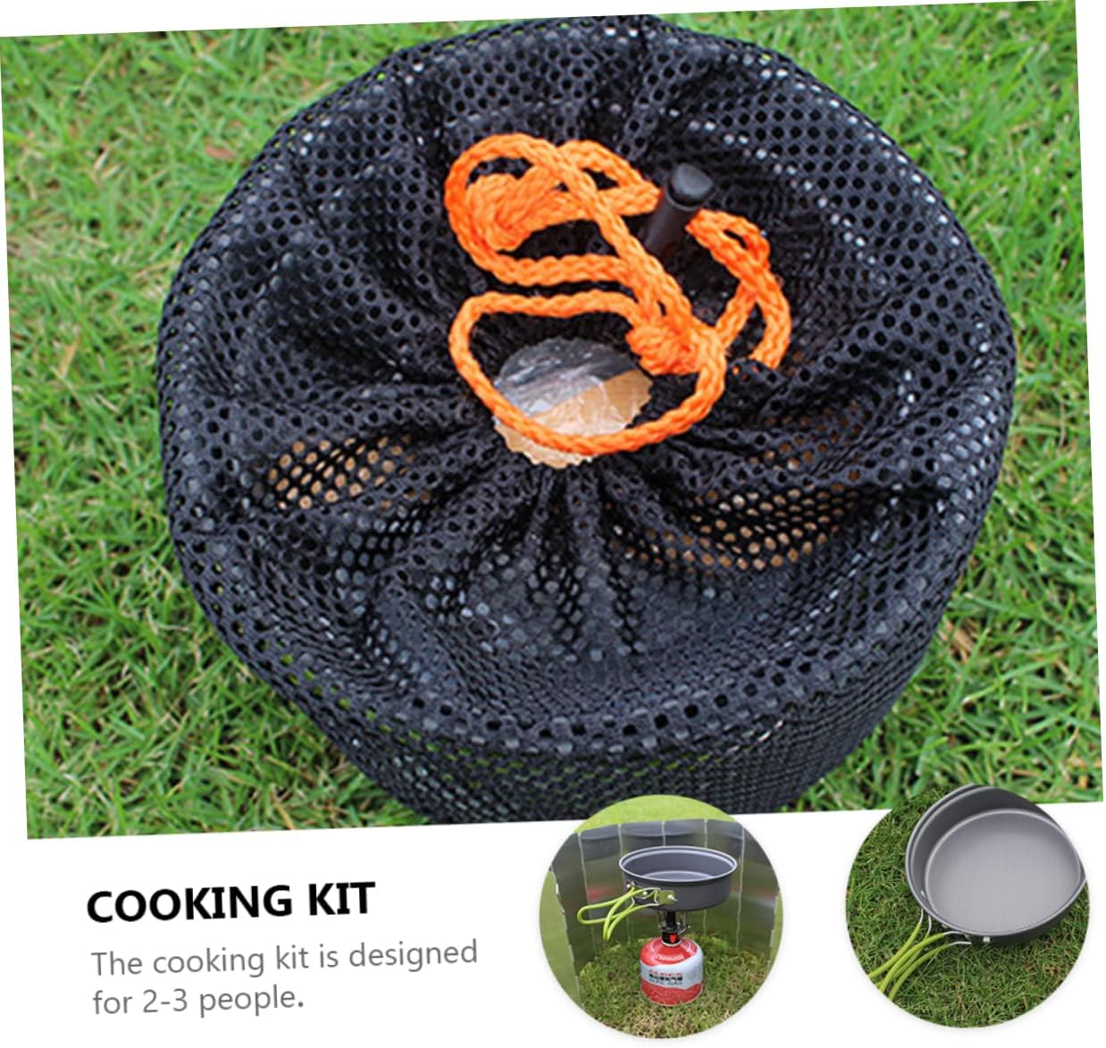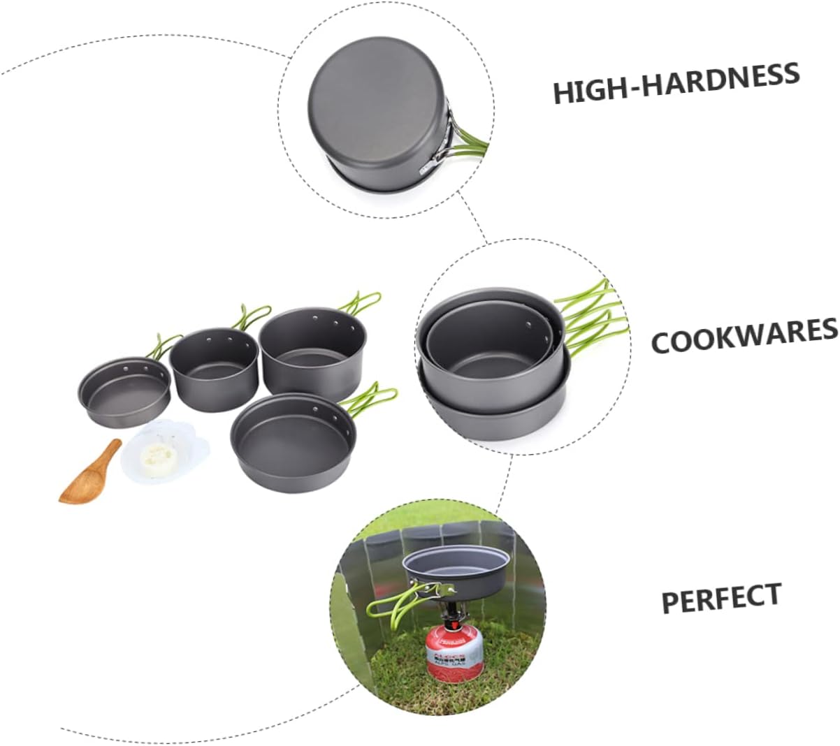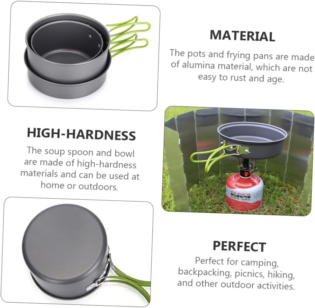 Package Include 1 x Small Pot 1 x Small Frying Pan 1 x Big Pot 1 x Big Frying Pan 1 x Soup Spoon 1 x Rice Spoon 3 x Bowls 1 x Cleaner Characteristics - Big Pot Size: Approx. 16.30X16.30X9.20cm/6.41X6.41X3.62in camping cooking pot - Big Frying Pan Size: Approx. 16.5X4.7cm/6.49X1.85in backpacking cooking pot -Product Info:Camping soup pot -Material: Oxidized aluminum alloy hiking pot -Color: Assorted cooking pot - Small Frying Pan Size: Approx. 14.3X4.1cm/5.63X1.61in camping cooking utensils - Small Pot Size: Approx. 14.8X8.0cm/5.83X3.15in camping tableware - Each cookware has a non-stick coating, which is easy to clean and durable Portable Pots Pans. - The insulated plastic handle prevents burns due to high temperatures. The non-slip design of the handle provides a firm and comfortable grip for your hands outdoor cooking equipment. - Compact and lightweight, convenient to carry, can cook anytime and anywhere camping cooking kit. - Multifunctional, can be used for cooking, frying, boiling and other cooking methods outdoor cookware. - It is a time-saving cooking toolkit, which is a wonderful for your family and friends who like outdoor camping camping cookware kit.Goods Descriptioncamping cook pot With this set, you can enjoy camping cooking time with your family.camping cooking kit A complete and durable cookware for camping, hiking, backpacking, picnic, lightweight and portable.camping kitchenware want to have a set of camping cookware? Then, our camping cookware set is your