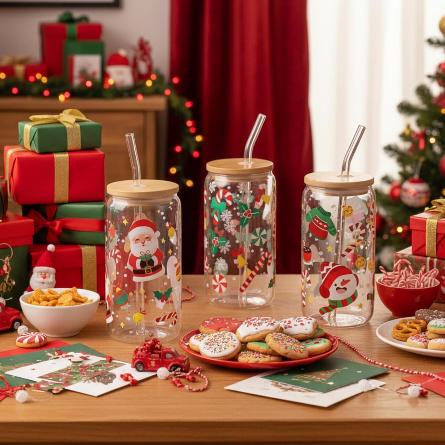 | Included Components | this Christmas glass cup set includes 12 pcs 16 oz glass cups, 12 bamboo lids, 12 reusable glass straws, and 6 cleaning brushes |