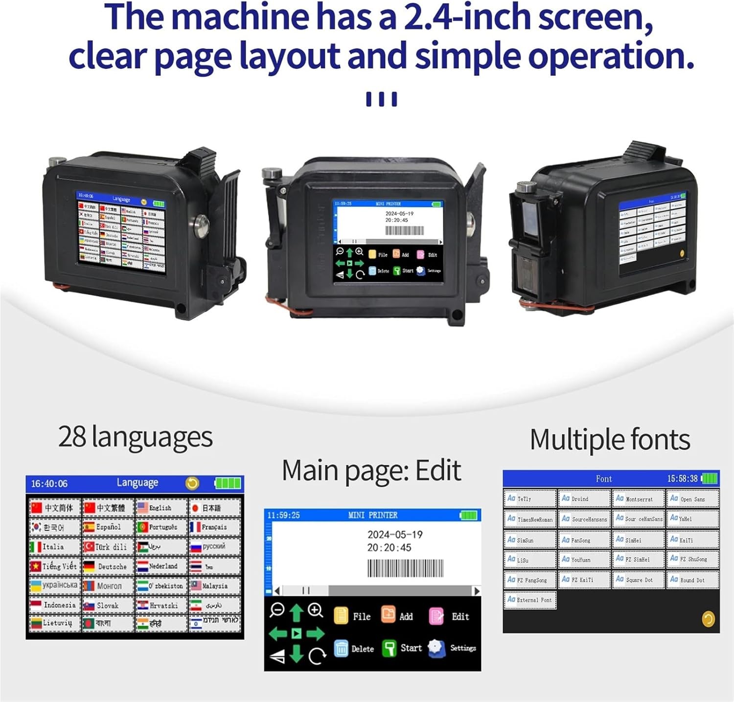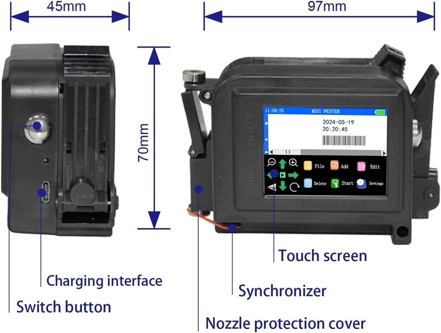 Product Description:Product Name: Mini Inkjet printerModel: E11Rated Power: 25WPrinting Height: 2mm-12.7mmPrinting Distance: 2mm-5mmPower Supply Mode: Fast Charge 3.0 AdapterPrint Resolution: 600dpi MaximumPower Input: DC-9V/2ACharging Interface: Type-CProduct Weight: 245gProduct Size: 97*70*45mmSystem Language: 28 LanguagesPrint Content: Time, Date, Counter, QR code, Barcode, Logo, etc.Printing Material: Glass, Wood, Carton, Pipe, Ceramics, Cable, Metal, Plastic, Curved or narrow surfaces, etc.==========Max. Resolution : 600*600dpiUse : Inkjet PrinterSignal Connection Type : NonePrint Speed : 40ppmDouble-sided Printing : YesSupports Network Printing : NoPaper Feed Mode : AutoMax Paper Size : A4Type : Inkjet PrinterType : Handheld Inkjet printerPackaging size : 22*14*11cmPrint size : 2mm-12.7mmPrint solution : 600dpi MaximumPrinting Direction : 360 degrees of arbitrary adjustment to meet various production needsOperational Environment : Temperature 0-45°(The best:20-30°)Humidity 40%-60%Rh