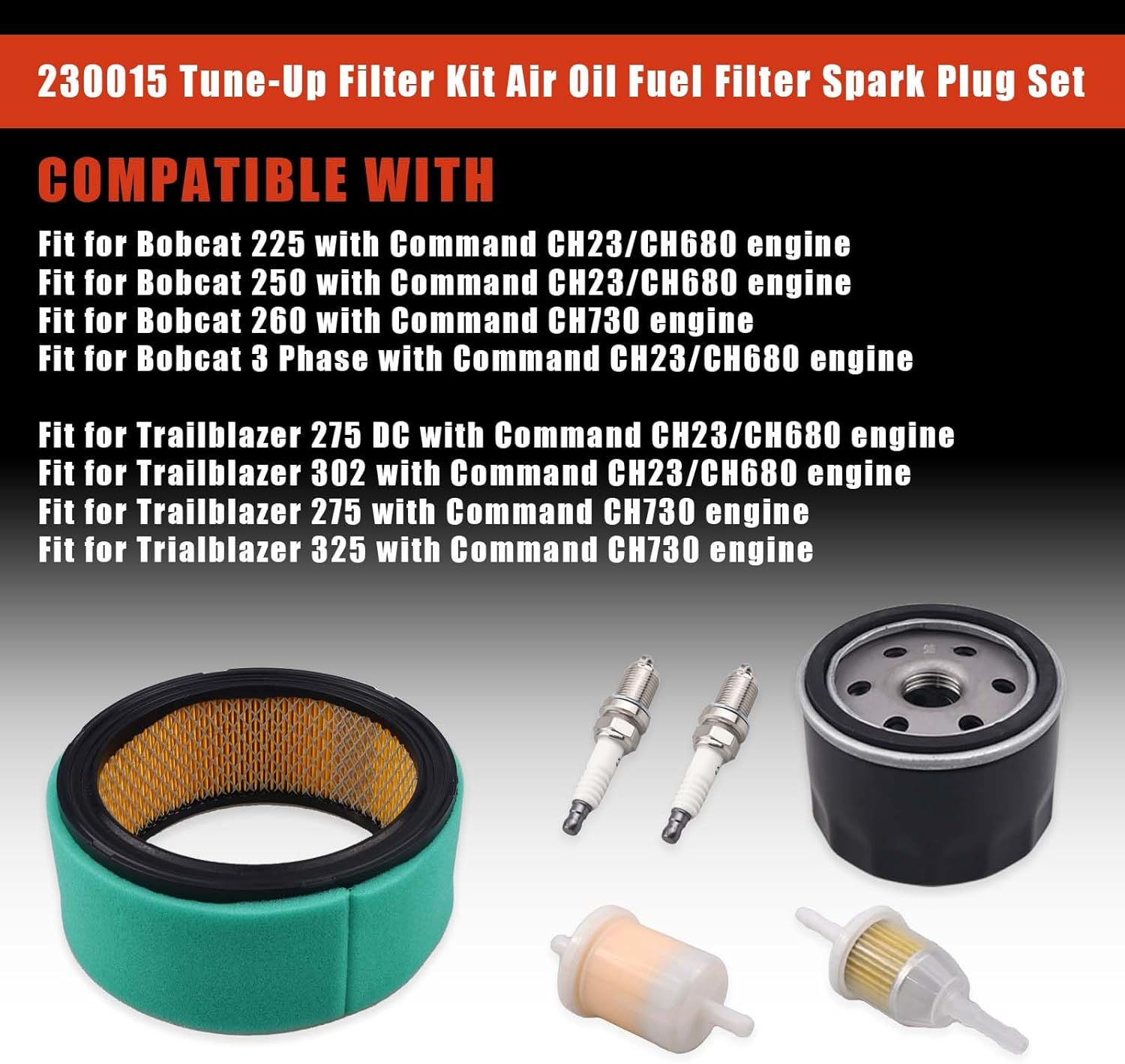 230015 Tune-Up Filter Kit Compatible with Miller Bobcat 225 260 & Trailblazer 325 Gas Engines Driven Welder Air Oil Fuel Filter Spark Plug Set, Replace 230016 230017 215984 067007 066698Compatibility: Fit for Bobcat 225 with Command CH23/CH680 engineFit for Bobcat 250 with Command CH23/CH680 engineFit for Bobcat 260 with Command CH730 engineFit for Bobcat 3 Phase with Command CH23/CH680 engineFit for Trailblazer 275 DC with Command CH23/CH680 engineFit for Trailblazer 302 with Command CH23/CH680 engineFit for Trailblazer 275 with Command CH730 engineFit for Trialblazer 325 with Command CH730 enginePackage Includes:1* Oil Filter (066698)1* Air Filter (230016)1* Fuel Filter (215984)2* Spark Plug (067007)1* Pre-Cleaner (230017)1*FilterFunction: Featuring multi-layered filter media, this filter traps contaminants, debris, and impurities in the fuel system. It safeguards engine components against wear, ensures consistent fuel flow, and promotes a longer engine lifespanQuality: This product is designed for premium durability, constructed from sturdy and long-lasting materials that effectively withstand wear and tearNote: This is a replacement part that is not manufactured by the original company. It is designed to be compatible with your device and will work just like the original component Please contact us if there is a problem and we will do our best to make it right!