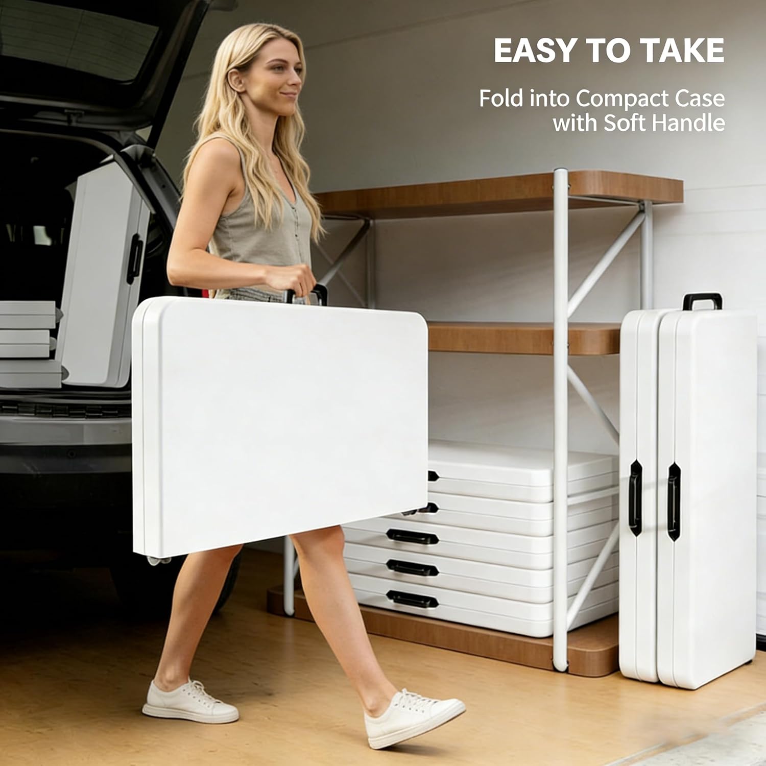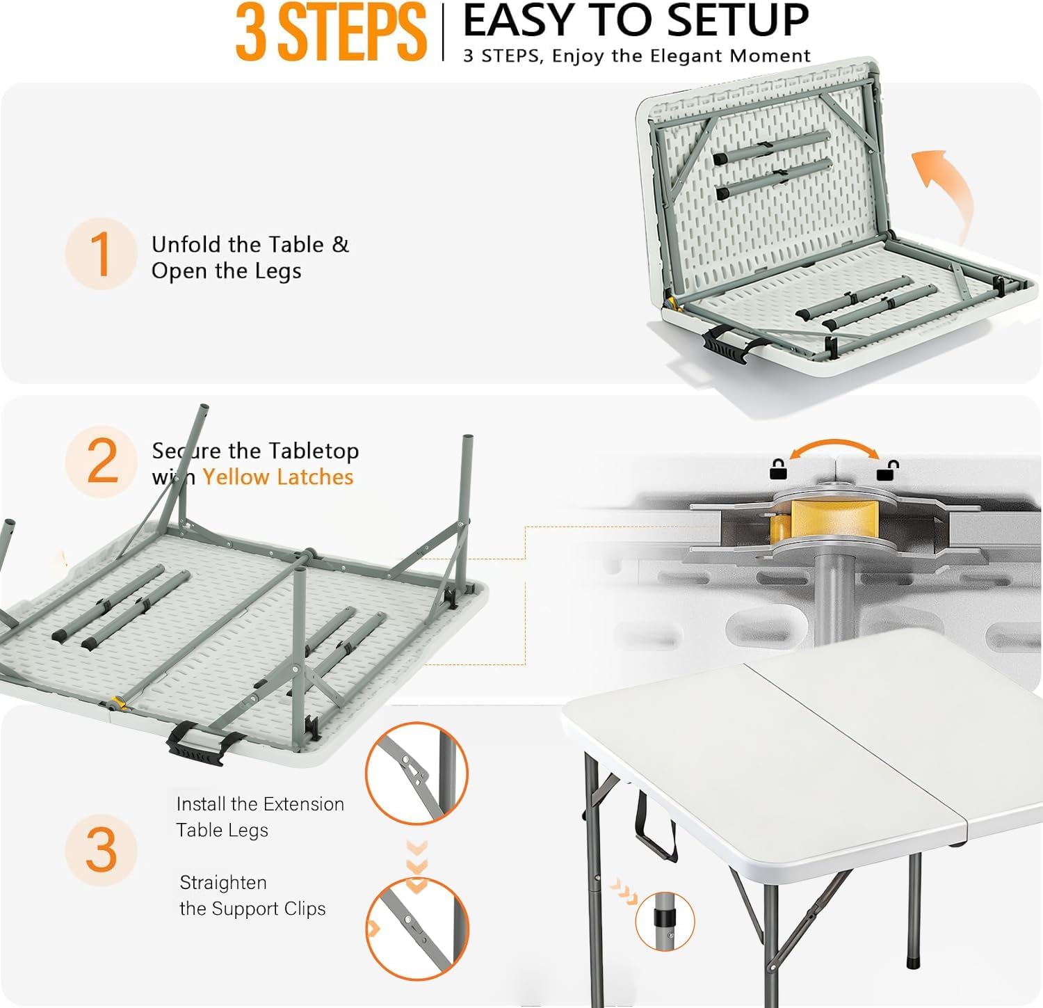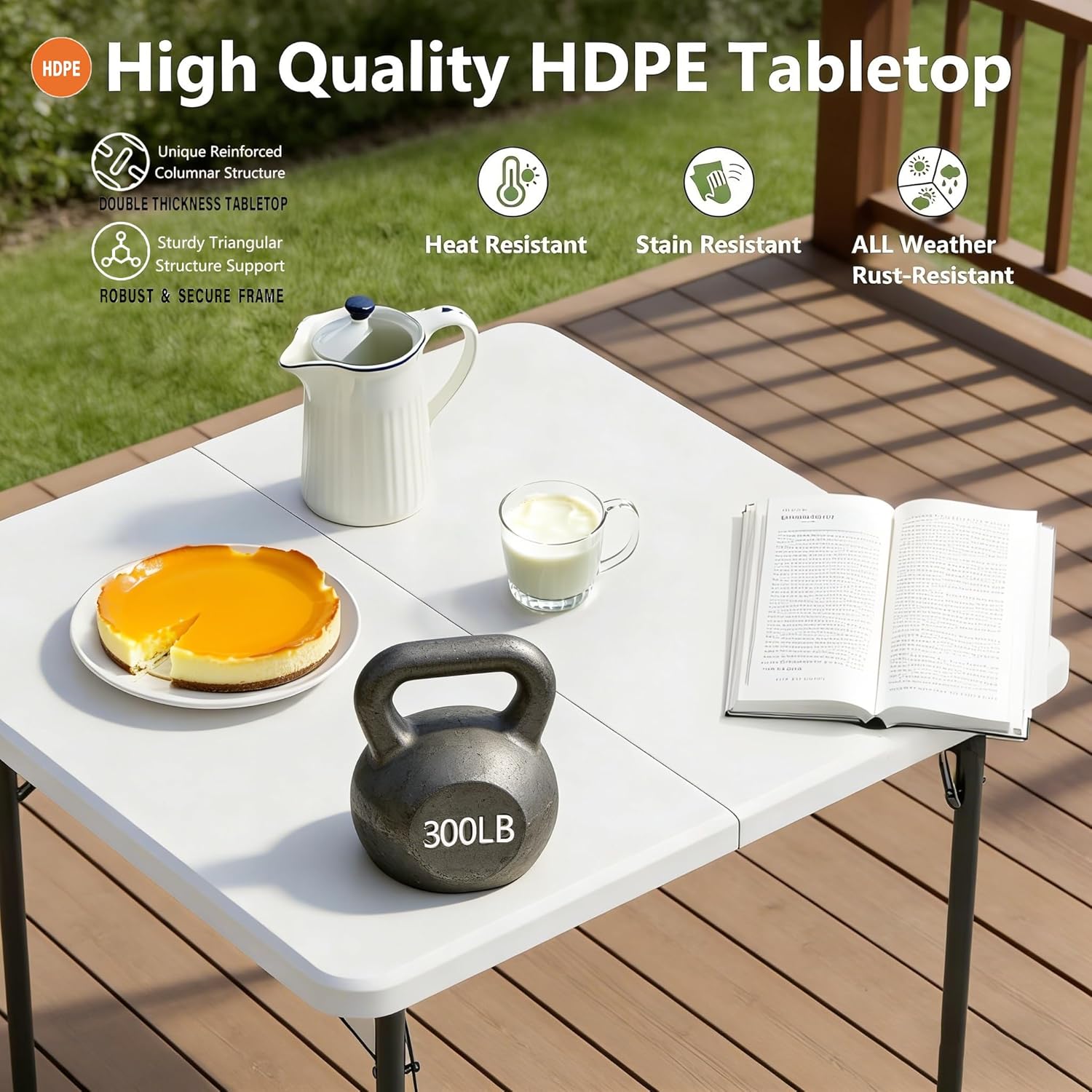 Introductions:This 34 inch square folding card table provides a sturdy and convenient surface for everyday use and special occasions. Built with a durable HDPE plastic tabletop and reinforced steel legs, the table offers excellent stability and long lasting durability. The spacious tabletop comfortably seats up to four people, making it ideal for card games, puzzles, dining, or temporary workspace use.The fold in half design with a built in carry handle allows the table to be easily transported and stored. Whether used at home, in the office, or outdoors, this portable folding table is perfect for parties, picnics, camping trips, meetings, and family gatherings. When not in use, it folds compactly for convenient storage in closets, garages, or car trunks.Features:1. Durable HDPE plastic tabletop with reinforced steel legs for stability2. Fold in half design with built in carry handle for easy transport3. Supports up to 300 lbs for reliable everyday use4. No tools required, quick setup and foldable legs for compact storage5. Waterproof and easy to clean surface for indoor and outdoor useSpecifications:1. Color: White2. Overall Dimensions: (34 x 34 x 29)” / (86 x 86 x 74) cm (L x W x H)3. Folded Dimensions: (34 x 17 x 3)” / (86 x 43 x 7.5) cm4. Material: HDPE Plastic Tabletop with Steel Frame5. Weight Capacity: 300 lbs6. Product Weight: 17.2 lbs