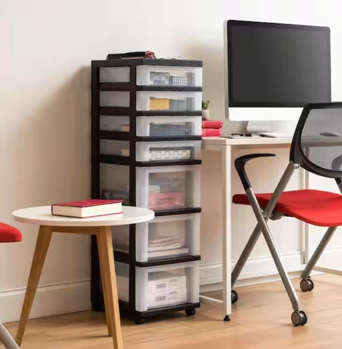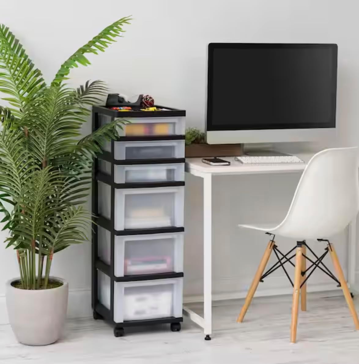 This versatile 6-drawer storage cart is designed to help you keep your space organized effortlessly. It features three spacious drawers and three shallow drawers, offering ample storage for a variety of items, from office supplies to crafting materials. The built-in divided organizer top ensures that small accessories are neatly arranged and easily accessible. With dimensions of 14.25 in. L x 12.05 in. W x 37.75 in. H, this cart is a convenient storage and organizational solution for offices, hobby rooms, dorms, and more. The smooth-glide casters provide easy mobility, while the built-in drawer stops prevent the drawers from falling out when opened.
