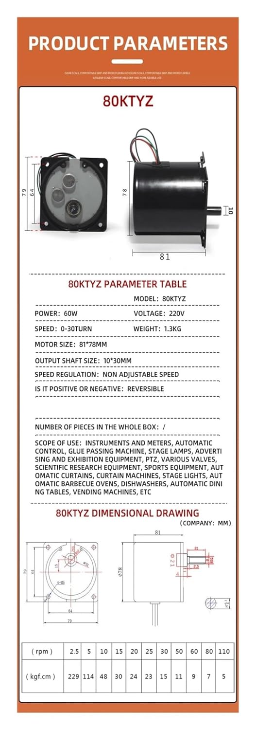 80KTYZ Permanent Magnet Synchronous Motors Controllable Positive Negative Inversion Metal Geared Reducer AC Electric Motor 220V1. 80KTYZ Mini 220V AC Permanent Magnet Synchronous Motor2. The motor has the following voltage options: AC 220V3. AC 220V ; You can choose the no load speed have : 5rpm ; 10rpm ; 20rpm ; 30rpm ; 50rpm Rated torque between 3 To 100 KGF.CM; Select a no load speed in AC 220V, there will be corresponding rated torque,please refer to the parameter table below.4. The direction of rotation of the motor : CW and CCW; Support Reversed ; But the speed of this motor is fixed, the speed cannot be adjusted.5. Power : 60W 6. Outstanding features of the motor: The motor is a permanent magnet synchronous motor ; Internal is metal gears ;Low speed and low noise 30dB ; Support continuous operation for 24 hours ; Speed adjustment is not supported ;5,000 hours of life under normal use ; Use materials ; Small size ; High torque ; Low power consumption ; Light weight and easy to use7. Motor application range : Automatic barbecue shelf; Automatic dining table; Curtain machine; Dishwasher; Automation control, etc.8. For the torque, size, product picture or other informations of the motor, please see the following information.ThankModel Number : 80KTYZPhase : Single-phaseProtect Feature : Totally EnclosedType : Synchronous MotorEfficiency : IE 2AC Voltage : 208-230 / 240 VOutput Voltage : 60WSpeed : 5-50 rpm/minFeature 1 : High TorqueFeature 2 : Synchronous MotorFeature 3 : Speed Reducer MotorsFeature 4 : Metal GearedFeature 5 : Copper Coil