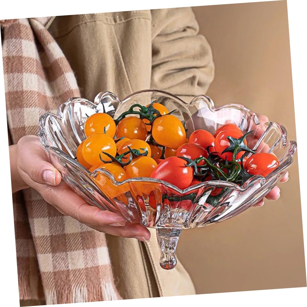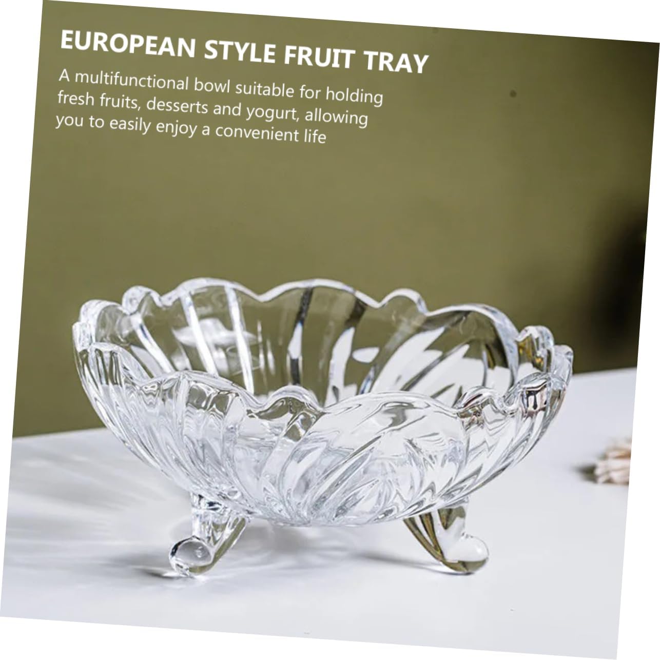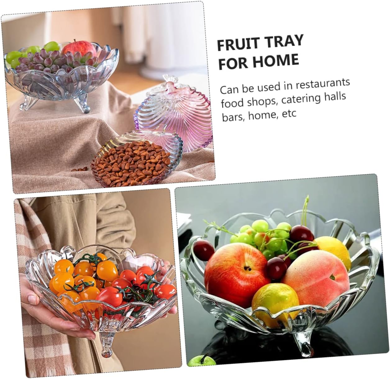 Package Include 1 x fruit tray Features -Color: Transparent dinner tray -Material: Glass Glass Dessert Stand -Size(950ml): About 23.50X23.50X10.60cm/9.24X9.24X4.17inch glass fruit bowl -It is creative , but it's to use, which will give you a fantastic use experience fruit stand. -Distinctive tableware, whether for daily use or home decoration, it is a very fruit bowl for kitchen counter. -Using glass material of high-grade and fine craftsmanship, for long serving life fruit rack stand. -Great and perfect for salad, fruit display to entertain your guests on birthday, wedding, Christmas fruit tray business. -Multipurpose, it can be used for storing fruits, salad, snacks, desserts, ice cream, etc Glass Tray.Goods Informationfruit rack stand With fine workmanship and creative appearance design, made of premium glass material, easy to clean and store.Glass Tray Are you looking for a household bowl that is both beautiful and ? Then you miss this product.Fruit Tray for can be used as salad bowl, food bowl, and even noodle bowl