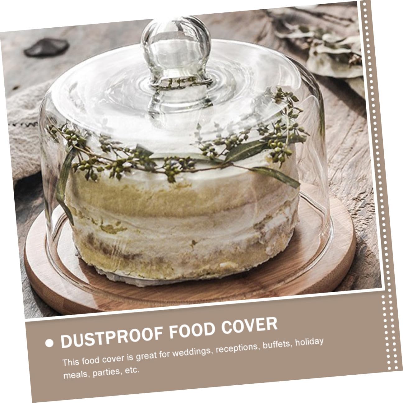 Package Include 1 x glass cake cover 1 x round base Features - Color: As shown. - Size: About 24.00X24.00X12.00cm/9.43X9.43X4.72in. - Material: Wood and glass. -Product Info:Cake cover - Made of glass material, safe and convenient for a long time use. - The handle is small, round and smooth shape and convenient to take Cake Displaying Cover. - Compatible with multiple occasion, such as home, hotel, restaurant, etc Food Cover. - Clear design, can see the appearance of your delicious food cake dome lid. - Simple shape and look design is very stylish and generous, and sturdy Protective Cake Cover.Goods Informationcupcake glass cover Are you looking for a professional, yet food cover? Are you in search of a sturdy food cover that offers you a comfortable use experience? If your answer is yes, please come and take at this product!