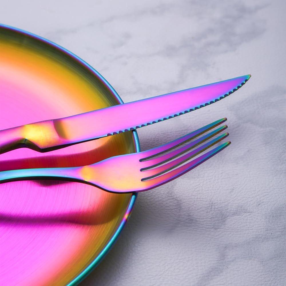Size 1. Double-layers hammered cups capacity: 11.8 oz(350 ml), Heights: 4.9 inch(12.5 cm), Width: 3 inch(7.8 cm), Weight: 0.28 LB(129 g) 2. Round plates width: 9 inch(23 cm), Weight: 0.45 LB(203 g) 3. Serrated steak knives length: 8.66 inch(22 cm), Weight: 0.23 LB(106 g) 4. Dinner forks length: 8.26 inch(21 cm), Weight: 0.13 LB(57.4 g)