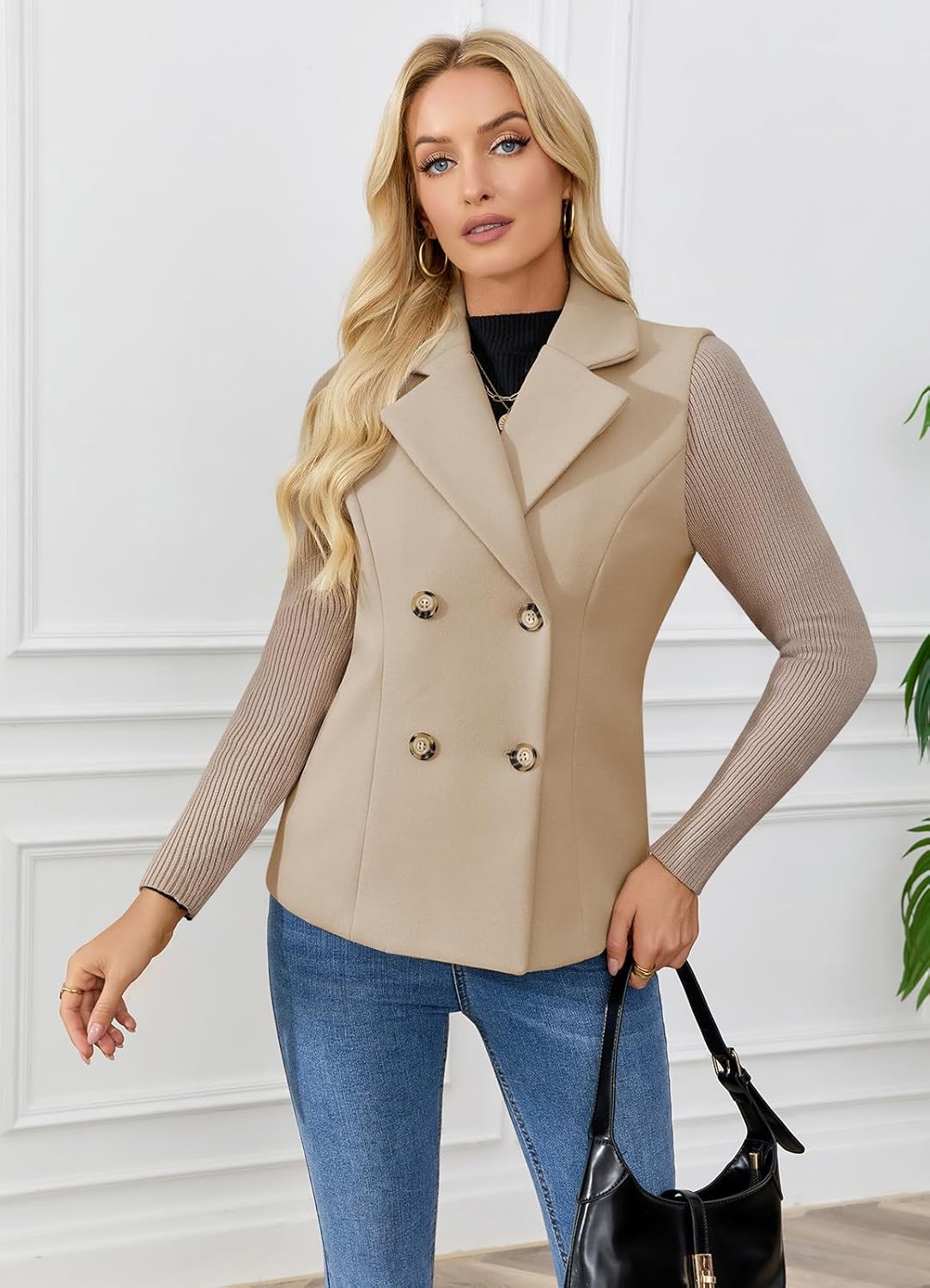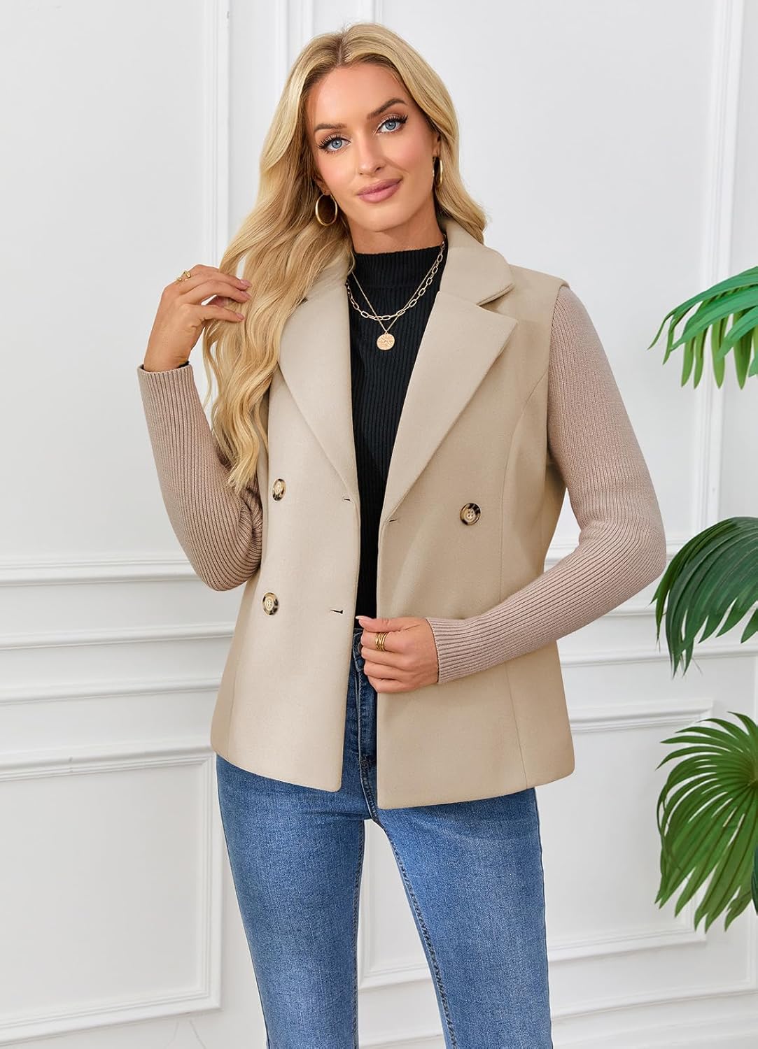 Womens Fashion Lapel Button Down Patchwork Knitted Sleeves Sweater Jacket Double Breasted Wool Blend Coat Peacoat with PocketsVariety of colors for availableSizs:XS-2XLUnique and chic blazer jacket, short wool coat, thick and warm winter fall overcoat