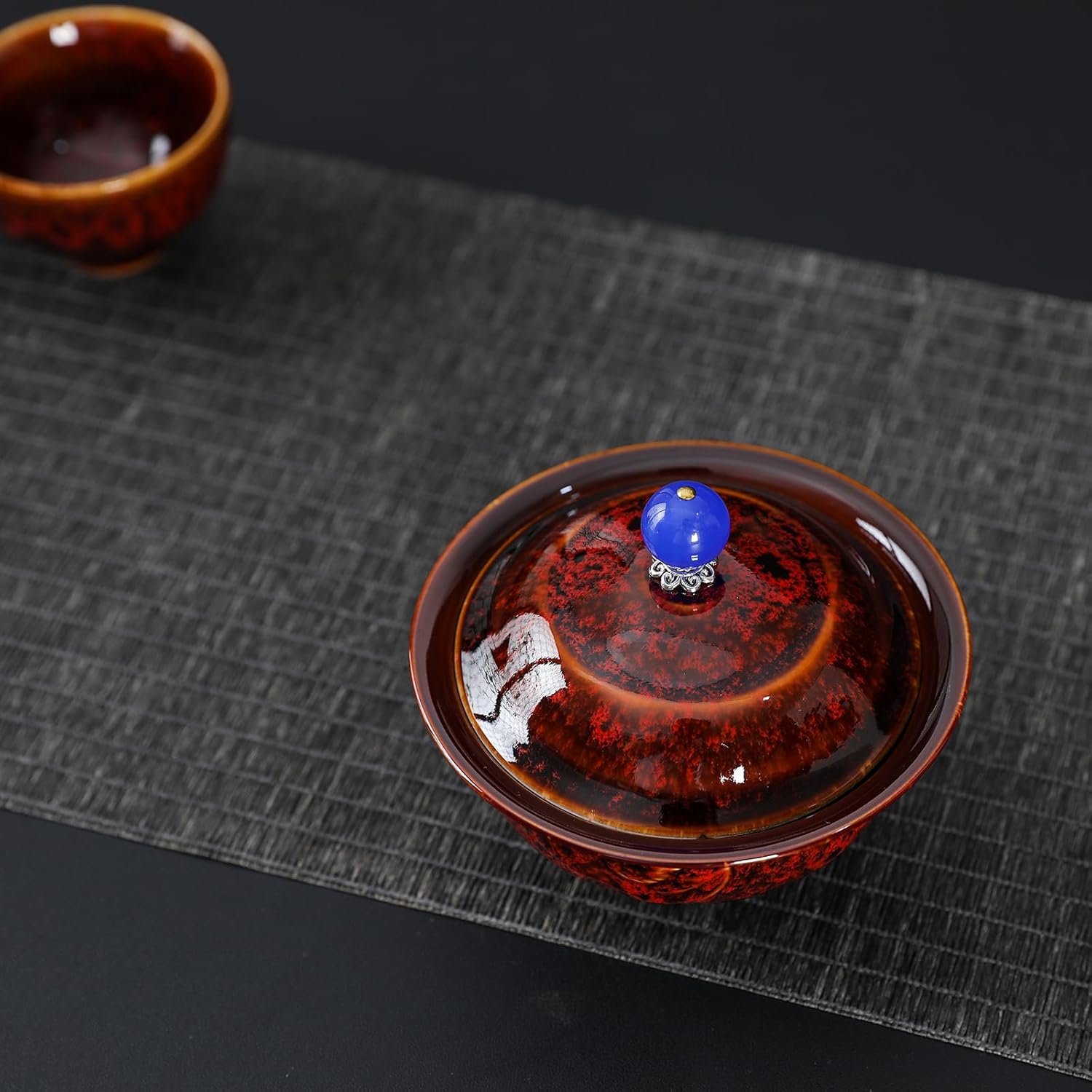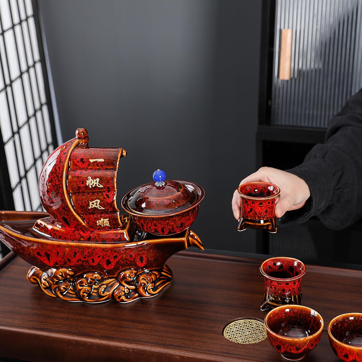 Superior Quality: Our Semi-automatic Gongfu Tea Set is meticulously crafted at 1300 degrees Celsius, ensuring a smooth, scratch-resistant interior surface that is easy to clean and free from any undesired odors, making it perfect for brewing various types of tea without compromising on taste. Innovative Design: The set includes 1 semi-automatic base, 1 Gaiwan, 6 tea cups, 2 master cups, and 1 fairness cup. The base features a hand-carved three-dimensional sailboat, symbolizing smooth sailing and wishing you all the best. Each piece undergoes a natural color transformation during high-temperature firing, resulting in a unique set that doubles as a thoughtful gift or elegant decor accent. Effortless Brewing Experience: Simply place the Gaiwan on the semi-automatic base, add tea leaves and hot water, then rotate the bowl to allow the brewed tea to flow out smoothly through the outlet without scalding your hands. The bowl's bottom filter ensures a seamless brewing experience with loose-leaf teas, eliminating worries of tea leaves. Versatile Capacities & Dimensions: The 11-inch long by 8.6-inch high base accommodates the 4.4oz Gaiwan. The tea cups have a 2.4-ounce capacity, while the master cup and fair cup hold 2.4 ounces and 4.4 ounces, respectively. The dimensions are carefully crafted for optimal functionality and ease of use, enhancing the traditional Gongfu tea ritual. Exceptional Customer Service: Your satisfaction is our priority. Should any issues arise upon receiving the product, please reach out to us immediately for a prompt resolution. We are dedicated to ensuring you have a delightful shopping experience and enjoy the authentic Gongfu tea brewing process hassle-free.
