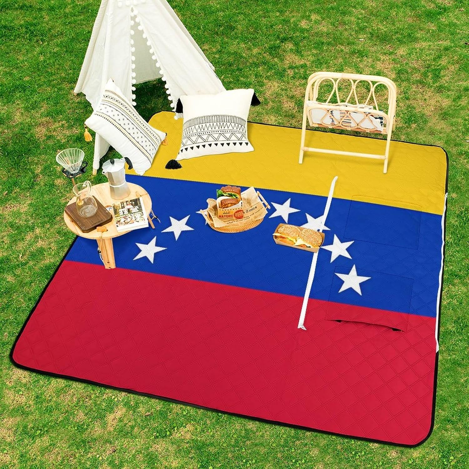 The picnic blanket ,we've only used the highest quality materials, so every picnic is an experience .The underside lining is very sturdy and therefore suitable for every surface. No more worrying about dirty or wet bottoms when you are sitting on damp grass. The Flag of Venezuela blanket protects you from water, dust and dirt.A large capacity bag and a picnic blanket, 2in1. It has a large capacity and one bag can hold everything you need for going out. You choose the place you want to lie down, and this bag can be turned into a comfortable picnic blanket in seconds also it can fold into tote bag, which is waterproof, sand-proof and wear-resistant.Therefor,you can take it to nearby parks, campuses, beaches or lawn, anywhere you want to lie down.