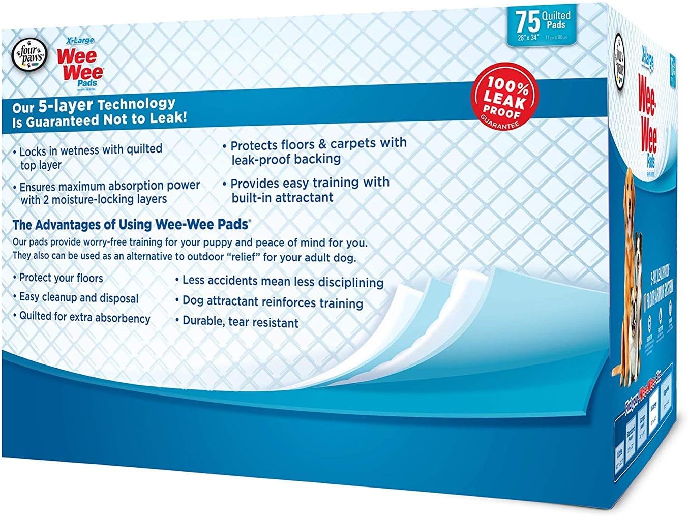 Four Paws Wee-Wee Pads, X-Large are quilted for super absorbency. Made with a 5-ply leak proof Floor Armor System, Wee-Wee pads provide the leak proof, absorbing performance you've come to expect from a top quality brand. Scientifically treated to attract dogs when nature calls, Wee-Wee pads offer dogs and their pet parents more freedom and peace of mind. Features & Benefits: Dimensions: 28" x 34" Origin:China